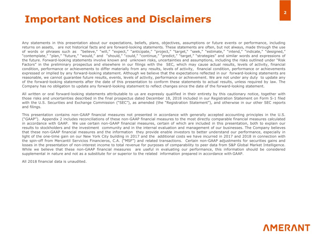 2 Important Notices and Disclaimers Any statements in this presentation about our expectations, beliefs, plans, objectives, assumptions or future events or performance, including returns on assets, are not historical facts and are forward-looking statements. These statements are often, but not always, made through the use of words or phrases such as “believe,” “will,” “expect,” “anticipate,” “project,” “target,“ “seek,” “estimate,” “intend,” “indicate,” “designed,” “contemplate,” “plan,” “future,” “would,” and “should,” “could,” “continue,” “predict,” “target,” “strategies” and similar words and expressions of the future. Forward-looking statements involve known and unknown risks, uncertainties and assumptions, including the risks outlined under “Risk Factors” in the preliminary prospectus and elsewhere in our filings with the SEC, which may cause actual results, levels of activity, financial condition, performance or achievements to differ materially from any results, levels of activity, financial condition, performance or achievements expressed or implied by any forward-looking statement. Although we believe that the expectations reflected in our forward-looking statements are reasonable, we cannot guarantee future results, events, levels of activity, performance or achievement. We are not under any duty to update any of the forward-looking statements after the date of this presentation to conform these statements to actual results, unless required by law. The Company has no obligation to update any forward-looking statement to reflect changes since the date of the forward-looking statement. All written or oral forward-looking statements attributable to us are expressly qualified in their entirety by this cautionary notice, together with those risks and uncertainties described in the final prospectus dated December 18, 2018 included in our Registration Statement on Form S-1 filed with the U.S. Securities and Exchange Commission (“SEC”), as amended (the “Registration Statement”), and otherwise in our other SEC reports and filings. This presentation contains non-GAAP financial measures not presented in accordance with generally accepted accounting principles in the U.S. (“GAAP”). Appendix 2 includes reconciliations of these non-GAAP financial measures to the most directly comparable financial measures calculated in accordance with GAAP. We use certain non-GAAP financial measures, certain of which are included in this presentation, both to explain our results to stockholders and the investment community and in the internal evaluation and management of our businesses. The Company believes that these non-GAAP financial measures and the information they provide enable investors to better understand our performance, especially in light of the one-time gain on our New York City building in 2017 and the additional costs we have incurred in 2017 and 2018 in connection with the spin-off from Mercantil Servicios Financieros, C.A. (“MSF”) and related transactions. Certain non-GAAP adjustments for securities gains and losses in the presentation of non-interest income to total revenue for purposes of comparability to peer data from S&P Global Market Intelligence. While we believe that these non-GAAP financial measures are useful in evaluating our performance, this information should be considered supplemental in nature and not as a substitute for or superior to the related information prepared in accordance with GAAP. All 2018 financial data is unaudited.