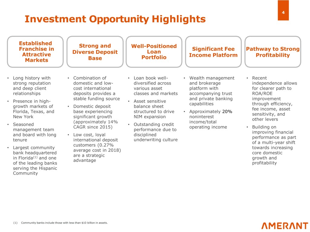 3 Who We Are Geographic Mix • Founded in 1979 December 31, 2018 • Acquired in 1987 by MSF(1) Loans Deposits History • 80.1% Spin-off in August 2018 • Adopted Amerant brand in October 2018 • Completed IPO in December 2018 • MSF no longer controls the Company(2) Headquarters • Coral Gables, FL Employees • 911 FTEs Financial Highlights • 23 branches throughout South Florida and ($ in millions, except per share data) 2015 2016 2017 2018 Footprint Houston, with loan production offices in NYC Balance Sheet and Dallas, Texas Assets $ 8,163 $ 8,434 $ 8,437 $ 8,124 Loans 5,623 5,765 6,066 5,920 Deposits 6,520 6,577 6,323 6,033 rd • 3 largest full-service bank headquartered (4) Market Share Tangible Common Equity 661 683 732 726 in Florida (5)(6) • Largest community bank in Florida(3) Income Statement Market Share Net Income $ 15.0 $ 23.6 $ 43.1 $ 45.8 Adjusted Net Income $ 15.0 $ 23.6 $ 48.4 $ 57.9 Adjusted Net Income per Share $ 0.35 $ 0.55 $ 1.14 $ 1.36 Assets • $8.1 billion Adjusted ROAA 0.19% 0.29% 0.57% 0.69% Adjusted ROATCE 2.3% 3.5% 6.5% 8.2% Adjusted Efficiency Ratio 84.7% 78.0% 74.8% 74.0% Capital Tier 1 Common Ratio 10.1% 10.3% 10.7% 11.1% Deposits • $6.0 billion Tier 1 Capital Ratio 11.8% 11.9% 12.3% 12.7% Total Risk-based Capital 12.9% 13.1% 13.3% 13.5% Tangible Common Equity Ratio 8.1% 8.1% 8.7% 9.0% Tangible Book Value per Common Share $ 15.56 $ 16.08 $ 17.23 $ 16.82 (4) AUM • $1.6 billion under management/custody Credit NPAs / Assets 0.95% 0.85% 0.32% 0.22% NCOs (recoveries) / Avg Loans ''(0.01)% 0.32% 0.11% 0.18% (1) Mercantil Servicios Financieros, C.A. (“MSF”). (2) MSF owns no voting Company Class A shares and its remaining holdings of Company non-voting Class B shares are less than 5% of all Company shares. The Federal Reserve has formally determined that MSF does not control the Company. (3) Community banks include those with less than $10 billion in assets. (4) Reflects special one-time dividend of $40.0 million paid on March 13, 2018 to MSF in connection with the spin-off. (5) GAAP income is presented in Appendix 2. (6) ”Adjusted” is a non-GAAP financial measure. See Appendix 2 for a historical reconciliation of “Adjusted” measures to GAAP metrics.