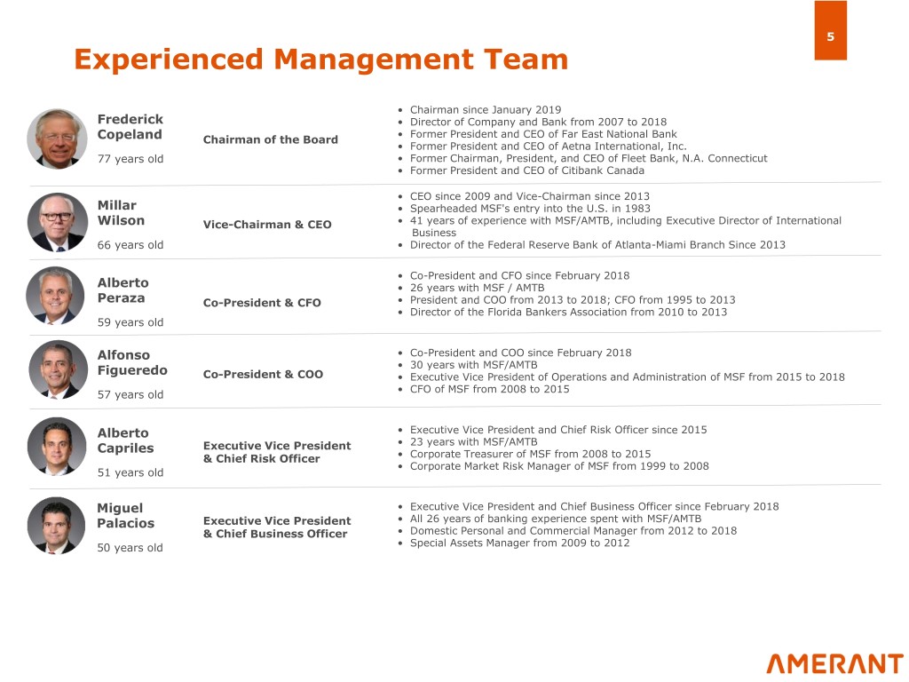 4 Investment Opportunity Highlights Established Strong and Well-Positioned Franchise in Significant Fee Pathway to Strong Loan Attractive Diverse Deposit Portfolio Income Platform Profitability Markets Base • Long history with • Combination of • Loan book well- • Wealth management • Recent strong reputation domestic and low- diversified across and brokerage independence allows and deep client cost international various asset platform with for clearer path to relationships deposits provides a classes and markets accompanying trust ROA/ROE stable funding source and private banking improvement • Presence in high- • Asset sensitive capabilities through efficiency, growth markets of • Domestic deposit balance sheet fee income, asset Florida, Texas, and base experiencing structured to drive • Approximately 20% sensitivity, and New York significant growth NIM expansion noninterest other levers (approximately 14% income/total • Seasoned • Outstanding credit CAGR since 2015) operating income • Building on management team performance due to improving financial and board with long • Low cost, loyal disciplined performance as part tenure international deposit underwriting culture of a multi-year shift customers (0.27% • Largest community towards increasing average cost in 2018) bank headquartered core domestic are a strategic in Florida(1) and one growth and advantage of the leading banks profitability serving the Hispanic Community (1) Community banks include those with less than $10 billion in assets.