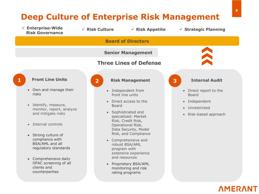 5 Experienced Management Team • Chairman since January 2019 Frederick • Director of Company and Bank from 2007 to 2018 • Former President and CEO of Far East National Bank Copeland Chairman of the Board • Former President and CEO of Aetna International, Inc. 77 years old • Former Chairman, President, and CEO of Fleet Bank, N.A. Connecticut • Former President and CEO of Citibank Canada • CEO since 2009 and Vice-Chairman since 2013 Millar • Spearheaded MSF's entry into the U.S. in 1983 Wilson Vice-Chairman & CEO • 41 years of experience with MSF/AMTB, including Executive Director of International Business 66 years old • Director of the Federal Reserve Bank of Atlanta-Miami Branch Since 2013 • Co-President and CFO since February 2018 Alberto • 26 years with MSF / AMTB Peraza Co-President & CFO • President and COO from 2013 to 2018; CFO from 1995 to 2013 • Director of the Florida Bankers Association from 2010 to 2013 59 years old Alfonso • Co-President and COO since February 2018 Figueredo • 30 years with MSF/AMTB Co-President & COO • Executive Vice President of Operations and Administration of MSF from 2015 to 2018 • CFO of MSF from 2008 to 2015 57 years old Alberto • Executive Vice President and Chief Risk Officer since 2015 • 23 years with MSF/AMTB Capriles Executive Vice President & Chief Risk Officer • Corporate Treasurer of MSF from 2008 to 2015 • Corporate Market Risk Manager of MSF from 1999 to 2008 51 years old Miguel • Executive Vice President and Chief Business Officer since February 2018 Palacios Executive Vice President • All 26 years of banking experience spent with MSF/AMTB & Chief Business Officer • Domestic Personal and Commercial Manager from 2012 to 2018 50 years old • Special Assets Manager from 2009 to 2012