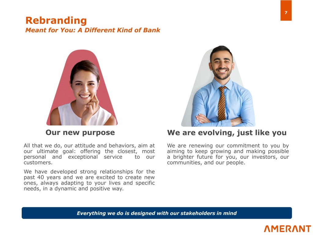 7 Rebranding Meant for You: A Different Kind of Bank Our new purpose We are evolving, just like you All that we do, our attitude and behaviors, aim at We are renewing our commitment to you by our ultimate goal: offering the closest, most aiming to keep growing and making possible personal and exceptional service to our a brighter future for you, our investors, our customers. communities, and our people. We have developed strong relationships for the past 40 years and we are excited to create new ones, always adapting to your lives and specific needs, in a dynamic and positive way. Everything we do is designed with our stakeholders in mind