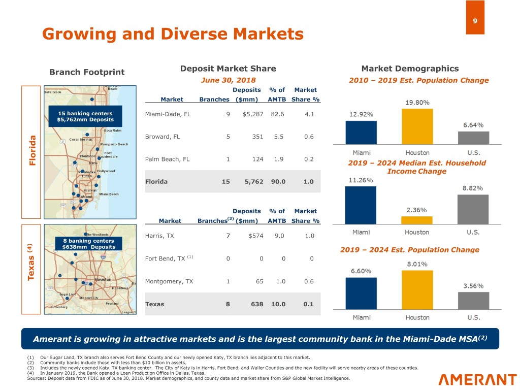 8 Attractive Franchise Our footprint spans some of the most attractive markets in the US Miami-Dade MSA Houston MSA NYC MSA • Major industry sectors of • Major industry sectors of • Major industry sectors of trade, tourism, services, health care, retail, oil/gas, education, health care, manufacturing, education, travel, and services tourism, financial services, real estate, and construction and professional / business • Unemployment rate of 3.9% services • Unemployment rate of 3.3% as of December 2018 as of December 2018 • Unemployment rate of 3.6% • Home to the world’s largest as of December 2018 • Ranked #1 MSA for startup medical complex activity by the 2017 • MSA has #1 GDP in the • Ranks #2 in manufacturing Kauffman Index among the nation GDP nationwide 39 largest MSAs • Top employers: • Top employers: • Top employers: Our markets are diverse with growing demographics and industry Sources: S&P Global Market Intelligence. US Bureau of Labor Statistics. Greater Houston Partnership (www.Houston.org). Business Facilities’ 2018 Metro Rankings Report. US Bureau of Economic Analysis. Center for Governmental Research. Company filings.