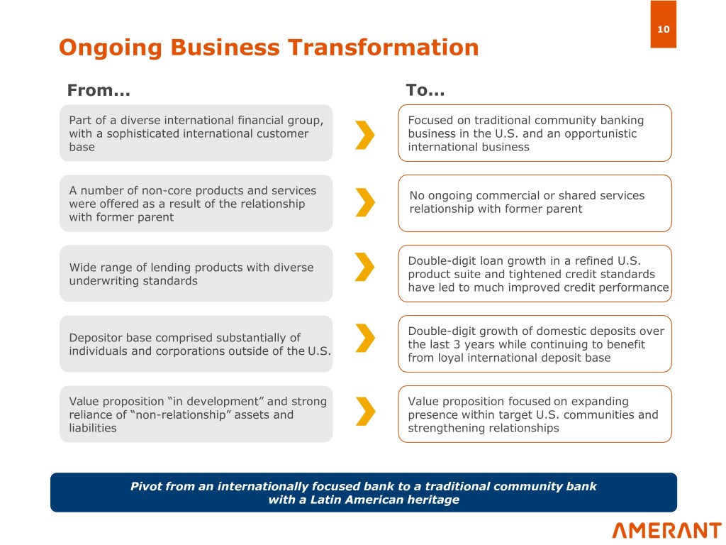 9 Growing and Diverse Markets Branch Footprint Deposit Market Share Market Demographics June 30, 2018 2010 – 2019 Est. Population Change Deposits % of Market Market Branches ($mm) AMTB Share % 15 banking centers Miami-Dade, FL 9 $5,287 82.6% 4.1% $5,762mm Deposits Broward, FL 5 351 5.5. 0.6. Palm Beach, FL 1 124 1.9. 0.2. Florida 2019 – 2024 Median Est. Household Income Change Florida 15 5,762 90.0 1.0. Deposits % of Market Market Branches(3) ($mm) AMTB Share % Harris, TX 7 $574 9.0% 1.0% 8 banking centers $638mm Deposits (4) 2019 – 2024 Est. Population Change Fort Bend, TX (1) 0 0 0 0. exas T Montgomery, TX 1 65 1.0 0.6. Texas 8 638 10.0 0.1. Amerant is growing in attractive markets and is the largest community bank in the Miami-Dade MSA(2) (1) Our Sugar Land, TX branch also serves Fort Bend County and our newly opened Katy, TX branch lies adjacent to this market. (2) Community banks include those with less than $10 billion in assets. (3) Includes the newly opened Katy, TX banking center. The City of Katy is in Harris, Fort Bend, and Waller Counties and the new facility will serve nearby areas of these counties. (4) In January 2019, the Bank opened a Loan Production Office in Dallas, Texas. Sources: Deposit data from FDIC as of June 30, 2018. Market demographics, and county data and market share from S&P Global Market Intelligence.
