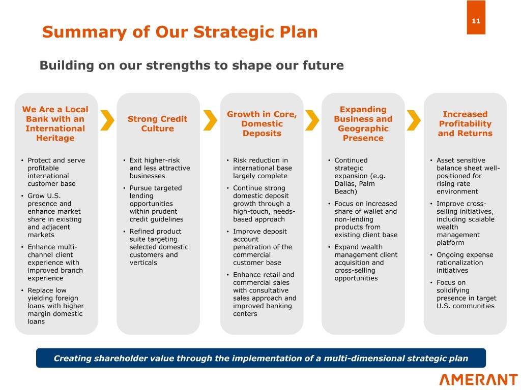 10 Ongoing Business Transformation From... To... Part of a diverse international financial group, Focused on traditional community banking with a sophisticated international customer business in the U.S. and an opportunistic base international business A number of non-core products and services No ongoing commercial or shared services were offered as a result of the relationship relationship with former parent with former parent Double-digit loan growth in a refined U.S. Wide range of lending products with diverse product suite and tightened credit standards underwriting standards have led to much improved credit performance Double-digit growth of domestic deposits over Depositor base comprised substantially of the last 3 years while continuing to benefit individuals and corporations outside of the U.S. from loyal international deposit base Value proposition “in development” and strong Value proposition focused on expanding reliance of “non-relationship” assets and presence within target U.S. communities and liabilities strengthening relationships Pivot from an internationally focused bank to a traditional community bank with a Latin American heritage