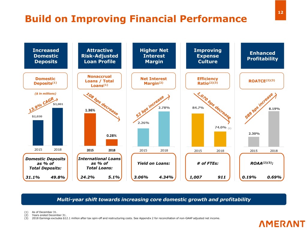 11 Summary of Our Strategic Plan Building on our strengths to shape our future We Are a Local Expanding Growth in Core, Increased Bank with an Strong Credit Business and Domestic Profitability International Culture Geographic Deposits and Returns Heritage Presence • Protect and serve • Exit higher-risk • Risk reduction in • Continued • Asset sensitive profitable and less attractive international base strategic balance sheet well- international businesses largely complete expansion (e.g. positioned for customer base Dallas, Palm rising rate • Pursue targeted • Continue strong Beach) environment • Grow U.S. lending domestic deposit presence and opportunities growth through a • Focus on increased • Improve cross- enhance market within prudent high-touch, needs- share of wallet and selling initiatives, share in existing credit guidelines based approach non-lending including scalable and adjacent products from wealth • Refined product • Improve deposit markets existing client base management suite targeting account platform • Enhance multi- selected domestic penetration of the • Expand wealth channel client customers and commercial management client • Ongoing expense experience with verticals customer base acquisition and rationalization improved branch cross-selling initiatives • Enhance retail and experience opportunities commercial sales • Focus on • Replace low with consultative solidifying yielding foreign sales approach and presence in target loans with higher improved banking U.S. communities margin domestic centers loans Creating shareholder value through the implementation of a multi-dimensional strategic plan