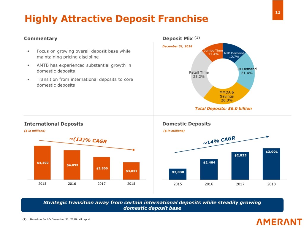 12 Build on Improving Financial Performance Increased Attractive Higher Net Improving Enhanced Domestic Risk-Adjusted Interest Expense Profitability Deposits Loan Profile Margin Culture Nonaccrual Domestic Net Interest Efficiency Loans / Total ROATCE(2)(3) Deposits(1) Margin(2) Ratio(2)(3) Loans(1) ($ in millions) 8.19% (1) 2.30% 2015 2018 Domestic Deposits International Loans as % of as % of Yield on Loans: # of FTEs: ROAA(2)(3): Total Deposits: Total Loans: 31.1% 49.8% 24.2% 5.1% 3.06% 4.34% 1,007 911 0.19% 0.69% Multi-year shift towards increasing core domestic growth and profitability (1) As of December 31. (2) Years ended December 31. (3) 2018 Earnings excludes $12.1 million after tax spin-off and restructuring costs. See Appendix 2 for reconciliation of non-GAAP adjusted net income.