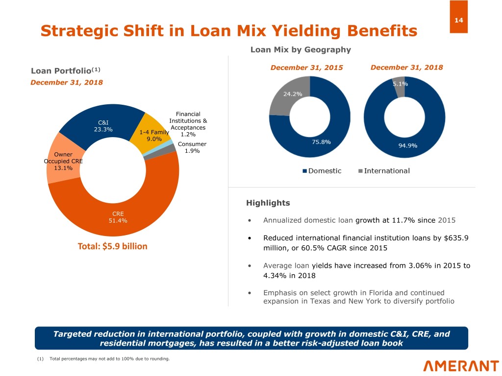 13 Highly Attractive Deposit Franchise Commentary Deposit Mix (1) December 31, 2018 • Focus on growing overall deposit base while maintaining pricing discipline • AMTB has experienced substantial growth in domestic deposits • Transition from international deposits to core domestic deposits Total Deposits: $6.0 billion International Deposits Domestic Deposits ($ in millions) ($ in millions) Strategic transition away from certain international deposits while steadily growing domestic deposit base (1) Based on Bank’s December 31, 2018 call report.