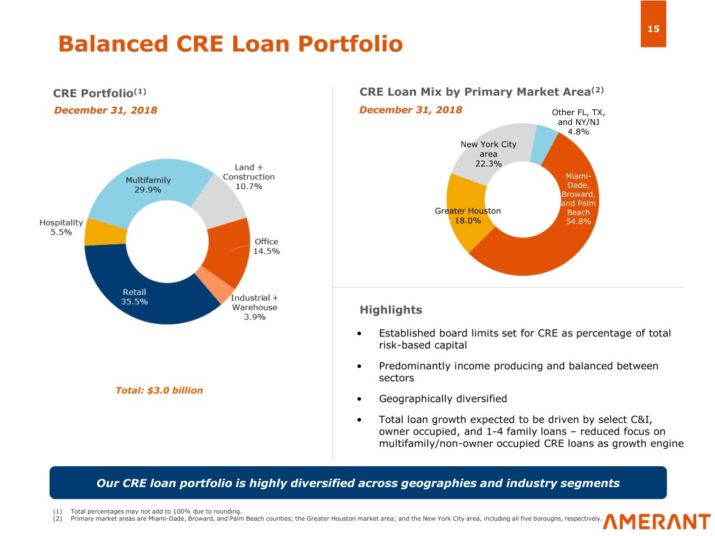 14 Strategic Shift in Loan Mix Yielding Benefits Loan Mix by Geography Loan Portfolio(1) December 31, 2015 December 31, 2018 December 31, 2018 Financial C&I Institutions & 23.3% Acceptances 1-4 Family 1.2% 9.0% Consumer 1.9% Owner Occupied CRE 13.1% Highlights CRE 51.4% • Annualized domestic loan growth at 11.7% since 2015 • Reduced international financial institution loans by $635.9 Total: $5.9 billion million, or 60.5% CAGR since 2015 • Average loan yields have increased from 3.06% in 2015 to 4.34% in 2018 • Emphasis on select growth in Florida and continued expansion in Texas and New York to diversify portfolio Targeted reduction in international portfolio, coupled with growth in domestic C&I, CRE, and residential mortgages, has resulted in a better risk-adjusted loan book (1) Total percentages may not add to 100% due to rounding.