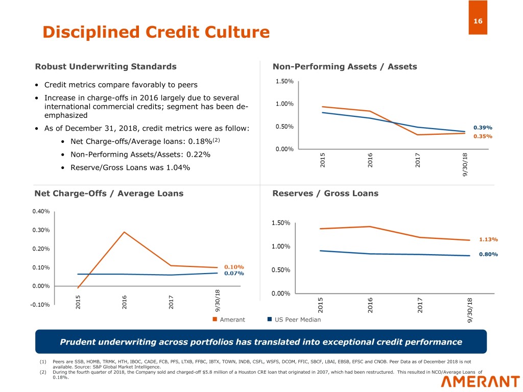 15 Balanced CRE Loan Portfolio CRE Portfolio(1) CRE Loan Mix by Primary Market Area(2) December 31, 2018 December 31, 2018 Other FL, TX, and NY/NJ 4.8% New York City area 22.3% Miami- Dade, Broward, and Palm Greater Houston Beach 18.0% 54.8% Highlights • Established board limits set for CRE as percentage of total risk-based capital • Predominantly income producing and balanced between sectors Total: $3.0 billion • Geographically diversified • Total loan growth expected to be driven by select C&I, owner occupied, and 1-4 family loans – reduced focus on multifamily/non-owner occupied CRE loans as growth engine Our CRE loan portfolio is highly diversified across geographies and industry segments (1) Total percentages may not add to 100% due to rounding. (2) Primary market areas are Miami-Dade, Broward, and Palm Beach counties; the Greater Houston market area; and the New York City area, including all five boroughs, respectively.
