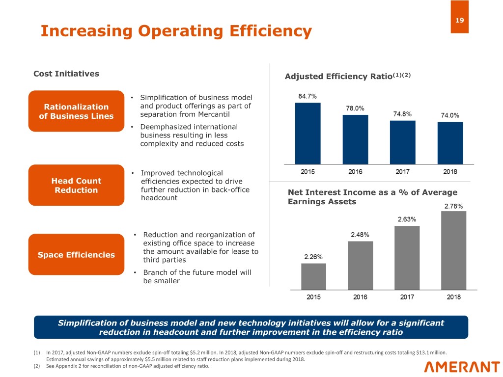 18 Robust Wealth Management Franchise Anchors Non-Interest Income Wealth Management Platform 2018 Non-Interest Income Breakdown Total: $53.9 million Amerant Trust Amerant Investments • Estate Planning • Wealth Management • Asset Protection • Brokerage Services • Escrow Services • Investment Advisory Services Adjusted Noninterest Income as a % of Key Considerations Operating Revenue (1)(2) • Sophisticated wealth management and brokerage platform serving affluent international clientele – $1.6bn in assets under management/custody – Increased focus on domestic market cross-selling with commercial and middle market company owners • Deposit and service fees also contribute significant YTD 09/30/18 portion to non-interest income Amerant US Peer Median Expansion of fee income capabilities a key focal point and growth lever (1) Peers are SSB, HOMB, TRMK, HTH, IBOC, CADE, FCB, PFS, LTXB, FFBC, IBTX, TOWN, INDB, CSFL, WSFS, DCOM, FFIC, SBCF, LBAI, EBSB, EFSC and CNOB. Peer data as of December 31, 2018 is not yet available. Source: S&P Global Market Intelligence. (2) Noninterest Income adjusted to conform to S&P’s calculation for peer comparison purposes. See Appendix 2 for Non-GAAP reconciliation of adjustments for gain on sale NY Building and losses on securities sold.