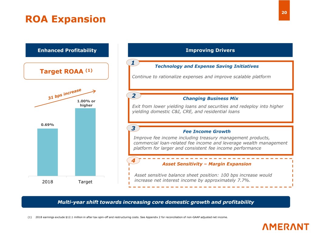 19 Increasing Operating Efficiency Cost Initiatives Adjusted Efficiency Ratio(1)(2) • Simplification of business model Rationalization and product offerings as part of of Business Lines separation from Mercantil • Deemphasized international business resulting in less complexity and reduced costs • Improved technological Head Count efficiencies expected to drive Reduction further reduction in back-office Net Interest Income as a % of Average headcount Earnings Assets • Reduction and reorganization of existing office space to increase Space Efficiencies the amount available for lease to third parties • Branch of the future model will be smaller Simplification of business model and new technology initiatives will allow for a significant reduction in headcount and further improvement in the efficiency ratio (1) In 2017, adjusted Non-GAAP numbers exclude spin-off totaling $5.2 million. In 2018, adjusted Non-GAAP numbers exclude spin-off and restructuring costs totaling $13.1 million. Estimated annual savings of approximately $5.5 million related to staff reduction plans implemented during 2018. (2) See Appendix 2 for reconciliation of non-GAAP adjusted efficiency ratio.
