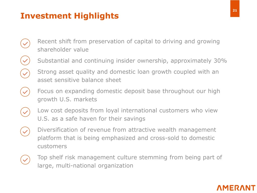 20 ROA Expansion Enhanced Profitability Improving Drivers 1 Technology and Expense Saving Initiatives Target ROAA (1) Continue to rationalize expenses and improve scalable platform 2 Changing Business Mix 1.00% or higher Exit from lower yielding loans and securities and redeploy into higher yielding domestic C&I, CRE, and residential loans 0.69% 3 Fee Income Growth Improve fee income including treasury management products, commercial loan-related fee income and leverage wealth management platform for larger and consistent fee income performance 4 Asset Sensitivity – Margin Expansion Asset sensitive balance sheet position: 100 bps increase would 2018 Target increase net interest income by approximately 7.7%. Multi-year shift towards increasing core domestic growth and profitability (1) 2018 earnings exclude $12.1 million in after tax spin-off and restructuring costs. See Appendix 2 for reconciliation of non-GAAP adjusted net income.
