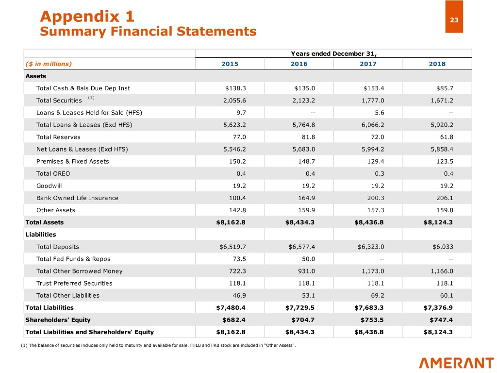 Appendix 1 23 Summary Financial Statements Years ended December 31, ($ in millions) 2015 2016 2017 2018 Assets Total Cash & Bals Due Dep Inst $138.3 $135.0 $153.4 $85.7 (1) Total Securities 2,055.6 2,123.2 1,777.0 1,671.2 Loans & Leases Held for Sale (HFS) 9.7 -- 5.6 -- Total Loans & Leases (Excl HFS) 5,623.2 5,764.8 6,066.2 5,920.2 Total Reserves 77.0 81.8 72.0 61.8 Net Loans & Leases (Excl HFS) 5,546.2 5,683.0 5,994.2 5,858.4 Premises & Fixed Assets 150.2 148.7 129.4 123.5 Total OREO 0.4 0.4 0.3 0.4 Goodwill 19.2 19.2 19.2 19.2 Bank Owned Life Insurance 100.4 164.9 200.3 206.1 Other Assets 142.8 159.9 157.3 159.8 Total Assets $8,162.8 $8,434.3 $8,436.8 $8,124.3 Liabilities Total Deposits $6,519.7 $6,577.4 $6,323.0 $6,033 Total Fed Funds & Repos 73.5 50.0 -- -- Total Other Borrowed Money 722.3 931.0 1,173.0 1,166.0 Trust Preferred Securities 118.1 118.1 118.1 118.1 Total Other Liabilities 46.9 53.1 69.2 60.1 Total Liabilities $7,480.4 $7,729.5 $7,683.3 $7,376.9 Shareholders' Equity $682.4 $704.7 $753.5 $747.4 Total Liabilities and Shareholders' Equity $8,162.8 $8,434.3 $8,436.8 $8,124.3 (1) The balance of securities includes only held to maturity and available for sale. FHLB and FRB stock are included in "Other Assets".