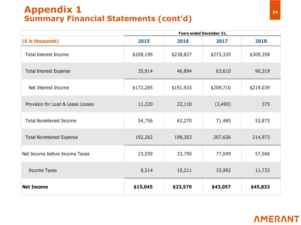 Appendix 1 24 Summary Financial Statements (cont’d) Years ended December 31, ($ in thousands) 2015 2016 2017 2018 Total Interest Income $208,199 $238,827 $273,320 $309,358 Total Interest Expense 35,914 46,894 63,610 90,319 Net Interest Income $172,285 $191,933 $209,710 $219,039 Provision for Loan & Lease Losses 11,220 22,110 (3,490) 375 Total Noninterest Income 54,756 62,270 71,485 53,875 Total Noninterest Expense 192,262 198,303 207,636 214,973 Net Income before Income Taxes 23,559 33,790 77,049 57,566 Income Taxes 8,514 10,211 33,992 11,733 Net Income $15,045 $23,579 $43,057 $45,833