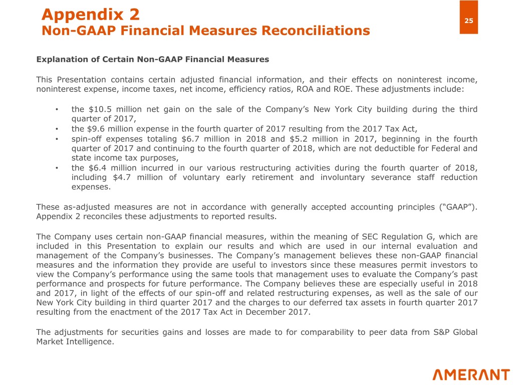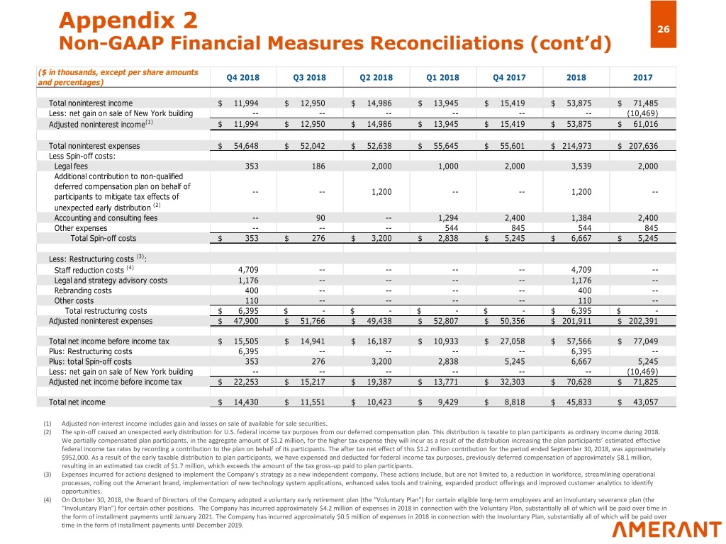 Appendix 2 25 Non-GAAP Financial Measures Reconciliations Explanation of Certain Non-GAAP Financial Measures This Presentation contains certain adjusted financial information, and their effects on noninterest income, noninterest expense, income taxes, net income, efficiency ratios, ROA and ROE. These adjustments include: • the $10.5 million net gain on the sale of the Company’s New York City building during the third quarter of 2017, • the $9.6 million expense in the fourth quarter of 2017 resulting from the 2017 Tax Act, • spin-off expenses totaling $6.7 million in 2018 and $5.2 million in 2017, beginning in the fourth quarter of 2017 and continuing to the fourth quarter of 2018, which are not deductible for Federal and state income tax purposes, • the $6.4 million incurred in our various restructuring activities during the fourth quarter of 2018, including $4.7 million of voluntary early retirement and involuntary severance staff reduction expenses. These as-adjusted measures are not in accordance with generally accepted accounting principles (“GAAP”). Appendix 2 reconciles these adjustments to reported results. The Company uses certain non-GAAP financial measures, within the meaning of SEC Regulation G, which are included in this Presentation to explain our results and which are used in our internal evaluation and management of the Company’s businesses. The Company’s management believes these non-GAAP financial measures and the information they provide are useful to investors since these measures permit investors to view the Company’s performance using the same tools that management uses to evaluate the Company’s past performance and prospects for future performance. The Company believes these are especially useful in 2018 and 2017, in light of the effects of our spin-off and related restructuring expenses, as well as the sale of our New York City building in third quarter 2017 and the charges to our deferred tax assets in fourth quarter 2017 resulting from the enactment of the 2017 Tax Act in December 2017. The adjustments for securities gains and losses are made to for comparability to peer data from S&P Global Market Intelligence.