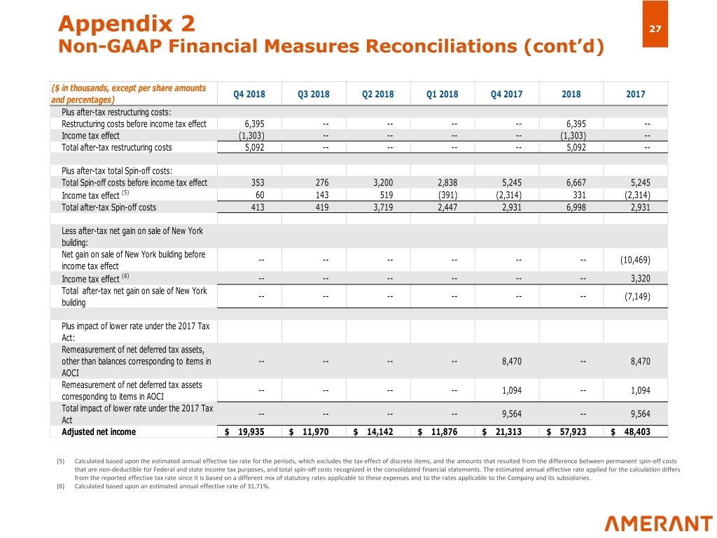 Appendix 2 26 Non-GAAP Financial Measures Reconciliations (cont’d) ($ in thousands, except per share amounts Q4 2018 Q3 2018 Q2 2018 Q1 2018 Q4 2017 2018 2017 and percentages) Total noninterest income $ 11,994 $ 12,950 $ 14,986 $ 13,945 $ 15,419 $ 53,875 $ 71,485 Less: net gain on sale of New York building -- -- -- -- -- -- (10,469) Adjusted noninterest income(1) $ 11,994 $ 12,950 $ 14,986 $ 13,945 $ 15,419 $ 53,875 $ 61,016 Total noninterest expenses $ 54,648 $ 52,042 $ 52,638 $ 55,645 $ 55,601 $ 214,973 $ 207,636 Less Spin-off costs: Legal fees 353 186 2,000 1,000 2,000 3,539 2,000 Additional contribution to non-qualified deferred compensation plan on behalf of -- -- 1,200 -- -- 1,200 -- participants to mitigate tax effects of unexpected early distribution (2) Accounting and consulting fees -- 90 -- 1,294 2,400 1,384 2,400 Other expenses -- -- -- 544 845 544 845 Total Spin-off costs $ 353 $ 276 $ 3,200 $ 2,838 $ 5,245 $ 6,667 $ 5,245 Less: Restructuring costs (3): Staff reduction costs (4) 4,709 -- -- -- -- 4,709 -- Legal and strategy advisory costs 1,176 -- -- -- -- 1,176 -- Rebranding costs 400 -- -- -- -- 400 -- Other costs 110 -- -- -- -- 110 -- Total restructuring costs $ 6,395 $ - $ - $ - $ - $ 6,395 $ - Adjusted noninterest expenses $ 47,900 $ 51,766 $ 49,438 $ 52,807 $ 50,356 $ 201,911 $ 202,391 Total net income before income tax $ 15,505 $ 14,941 $ 16,187 $ 10,933 $ 27,058 $ 57,566 $ 77,049 Plus: Restructuring costs 6,395 -- -- -- -- 6,395 -- Plus: total Spin-off costs 353 276 3,200 2,838 5,245 6,667 5,245 Less: net gain on sale of New York building -- -- -- -- -- -- (10,469) Adjusted net income before income tax $ 22,253 $ 15,217 $ 19,387 $ 13,771 $ 32,303 $ 70,628 $ 71,825 Total net income $ 14,430 $ 11,551 $ 10,423 $ 9,429 $ 8,818 $ 45,833 $ 43,057 (1) Adjusted non-interest income includes gain and losses on sale of available for sale securities. (2) The spin-off caused an unexpected early distribution for U.S. federal income tax purposes from our deferred compensation plan. This distribution is taxable to plan participants as ordinary income during 2018. We partially compensated plan participants, in the aggregate amount of $1.2 million, for the higher tax expense they will incur as a result of the distribution increasing the plan participants’ estimated effective federal income tax rates by recording a contribution to the plan on behalf of its participants. The after tax net effect of this $1.2 million contribution for the period ended September 30, 2018, was approximately $952,000. As a result of the early taxable distribution to plan participants, we have expensed and deducted for federal income tax purposes, previously deferred compensation of approximately $8.1 million, resulting in an estimated tax credit of $1.7 million, which exceeds the amount of the tax gross-up paid to plan participants. (3) Expenses incurred for actions designed to implement the Company’s strategy as a new independent company. These actions include, but are not limited to, a reduction in workforce, streamlining operational processes, rolling out the Amerant brand, implementation of new technology system applications, enhanced sales tools and training, expanded product offerings and improved customer analytics to identify opportunities. (4) On October 30, 2018, the Board of Directors of the Company adopted a voluntary early retirement plan (the “Voluntary Plan”) for certain eligible long-term employees and an involuntary severance plan (the “Involuntary Plan”) for certain other positions. The Company has incurred approximately $4.2 million of expenses in 2018 in connection with the Voluntary Plan, substantially all of which will be paid over time in the form of installment payments until January 2021. The Company has incurred approximately $0.5 million of expenses in 2018 in connection with the Involuntary Plan, substantially all of which will be paid over time in the form of installment payments until December 2019.