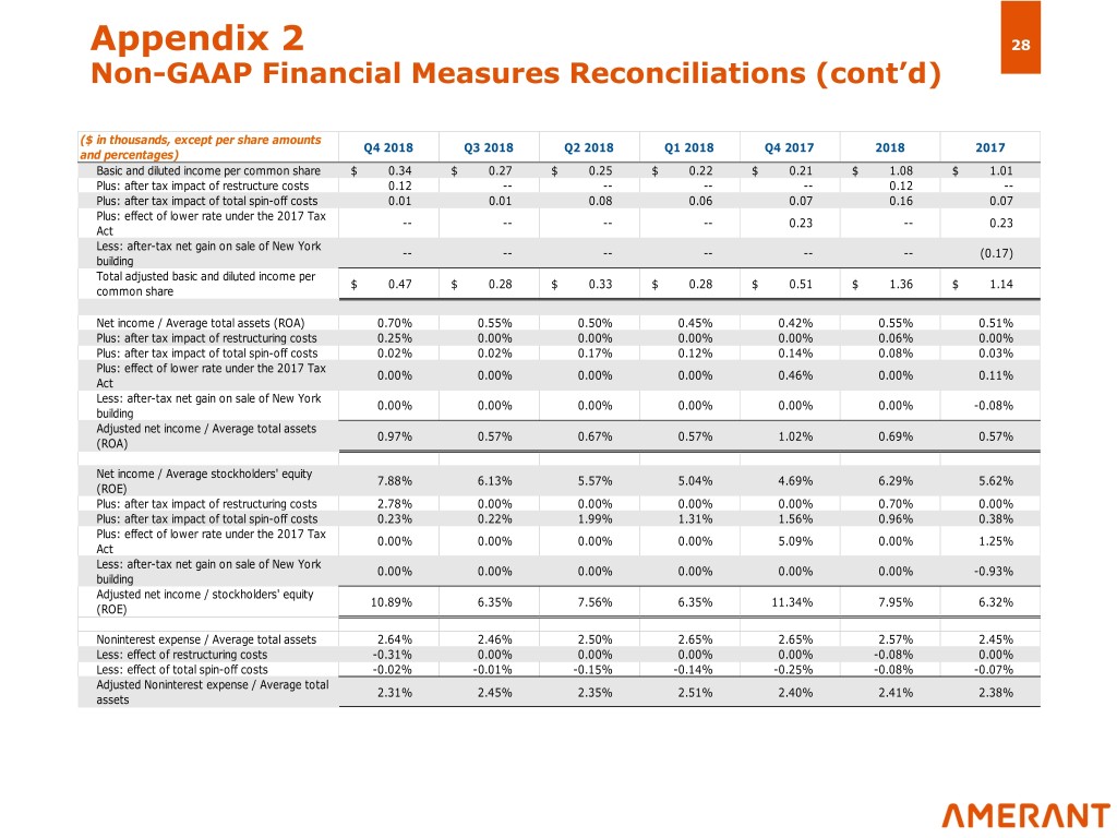 Appendix 2 27 Non-GAAP Financial Measures Reconciliations (cont’d) ($ in thousands, except per share amounts Q4 2018 Q3 2018 Q2 2018 Q1 2018 Q4 2017 2018 2017 and percentages) Plus after-tax restructuring costs: Restructuring costs before income tax effect 6,395 -- -- -- -- 6,395 -- Income tax effect (1,303) -- -- -- -- (1,303) -- Total after-tax restructuring costs 5,092 -- -- -- -- 5,092 -- Plus after-tax total Spin-off costs: Total Spin-off costs before income tax effect 353 276 3,200 2,838 5,245 6,667 5,245 Income tax effect (5) 60 143 519 (391) (2,314) 331 (2,314) Total after-tax Spin-off costs 413 419 3,719 2,447 2,931 6,998 2,931 Less after-tax net gain on sale of New York building: Net gain on sale of New York building before -- -- -- -- -- -- (10,469) income tax effect Income tax effect (6) -- -- -- -- -- -- 3,320 Total after-tax net gain on sale of New York -- -- -- -- -- -- (7,149) building Plus impact of lower rate under the 2017 Tax Act: Remeasurement of net deferred tax assets, other than balances corresponding to items in -- -- -- -- 8,470 -- 8,470 AOCI Remeasurement of net deferred tax assets -- -- -- -- 1,094 -- 1,094 corresponding to items in AOCI Total impact of lower rate under the 2017 Tax -- -- -- -- 9,564 -- 9,564 Act Adjusted net income $ 19,935 $ 11,970 $ 14,142 $ 11,876 $ 21,313 $ 57,923 $ 48,403 (5) Calculated based upon the estimated annual effective tax rate for the periods, which excludes the tax effect of discrete items, and the amounts that resulted from the difference between permanent spin-off costs that are non-deductible for Federal and state income tax purposes, and total spin-off costs recognized in the consolidated financial statements. The estimated annual effective rate applied for the calculation differs from the reported effective tax rate since it is based on a different mix of statutory rates applicable to these expenses and to the rates applicable to the Company and its subsidiaries. (6) Calculated based upon an estimated annual effective rate of 31.71%.