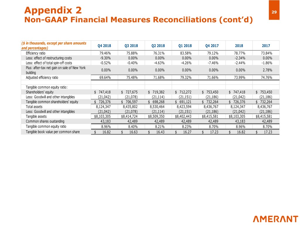 Appendix 2 28 Non-GAAP Financial Measures Reconciliations (cont’d) ($ in thousands, except per share amounts Q4 2018 Q3 2018 Q2 2018 Q1 2018 Q4 2017 2018 2017 and percentages) Basic and diluted income per common share $ 0.34 $ 0.27 $ 0.25 $ 0.22 $ 0.21 $ 1.08 $ 1.01 Plus: after tax impact of restructure costs 0.12 -- -- -- -- 0.12 -- Plus: after tax impact of total spin-off costs 0.01 0.01 0.08 0.06 0.07 0.16 0.07 Plus: effect of lower rate under the 2017 Tax -- -- -- -- 0.23 -- 0.23 Act Less: after-tax net gain on sale of New York -- -- -- -- -- -- (0.17) building Total adjusted basic and diluted income per $ 0.47 $ 0.28 $ 0.33 $ 0.28 $ 0.51 $ 1.36 $ 1.14 common share Net income / Average total assets (ROA) 0.70% 0.55% 0.50% 0.45% 0.42% 0.55% 0.51% Plus: after tax impact of restructuring costs 0.25% 0.00% 0.00% 0.00% 0.00% 0.06% 0.00% Plus: after tax impact of total spin-off costs 0.02% 0.02% 0.17% 0.12% 0.14% 0.08% 0.03% Plus: effect of lower rate under the 2017 Tax 0.00% 0.00% 0.00% 0.00% 0.46% 0.00% 0.11% Act Less: after-tax net gain on sale of New York 0.00% 0.00% 0.00% 0.00% 0.00% 0.00% -0.08% building Adjusted net income / Average total assets 0.97% 0.57% 0.67% 0.57% 1.02% 0.69% 0.57% (ROA) Net income / Average stockholders' equity 7.88% 6.13% 5.57% 5.04% 4.69% 6.29% 5.62% (ROE) Plus: after tax impact of restructuring costs 2.78% 0.00% 0.00% 0.00% 0.00% 0.70% 0.00% Plus: after tax impact of total spin-off costs 0.23% 0.22% 1.99% 1.31% 1.56% 0.96% 0.38% Plus: effect of lower rate under the 2017 Tax 0.00% 0.00% 0.00% 0.00% 5.09% 0.00% 1.25% Act Less: after-tax net gain on sale of New York 0.00% 0.00% 0.00% 0.00% 0.00% 0.00% -0.93% building Adjusted net income / stockholders' equity 10.89% 6.35% 7.56% 6.35% 11.34% 7.95% 6.32% (ROE) Noninterest expense / Average total assets 2.64% 2.46% 2.50% 2.65% 2.65% 2.57% 2.45% Less: effect of restructuring costs -0.31% 0.00% 0.00% 0.00% 0.00% -0.08% 0.00% Less: effect of total spin-off costs -0.02% -0.01% -0.15% -0.14% -0.25% -0.08% -0.07% Adjusted Noninterest expense / Average total 2.31% 2.45% 2.35% 2.51% 2.40% 2.41% 2.38% assets