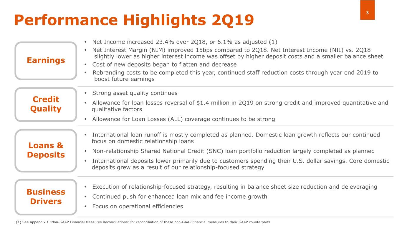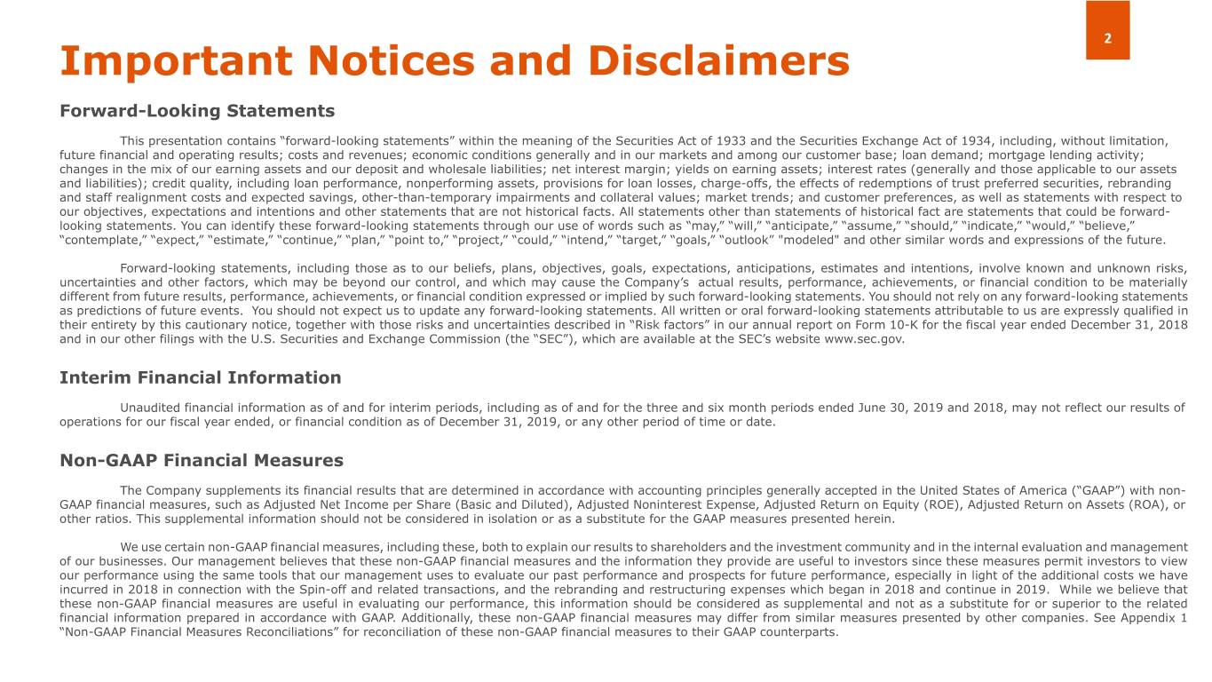 2 Important Notices and Disclaimers Forward-Looking Statements This presentation contains “forward-looking statements” within the meaning of the Securities Act of 1933 and the Securities Exchange Act of 1934, including, without limitation, future financial and operating results; costs and revenues; economic conditions generally and in our markets and among our customer base; loan demand; mortgage lending activity; changes in the mix of our earning assets and our deposit and wholesale liabilities; net interest margin; yields on earning assets; interest rates (generally and those applicable to our assets and liabilities); credit quality, including loan performance, nonperforming assets, provisions for loan losses, charge-offs, the effects of redemptions of trust preferred securities, rebranding and staff realignment costs and expected savings, other-than-temporary impairments and collateral values; market trends; and customer preferences, as well as statements with respect to our objectives, expectations and intentions and other statements that are not historical facts. All statements other than statements of historical fact are statements that could be forward- looking statements. You can identify these forward-looking statements through our use of words such as “may,” “will,” “anticipate,” “assume,” “should,” “indicate,” “would,” “believe,” “contemplate,” “expect,” “estimate,” “continue,” “plan,” “point to,” “project,” “could,” “intend,” “target,” “goals,” “outlook” "modeled" and other similar words and expressions of the future. Forward-looking statements, including those as to our beliefs, plans, objectives, goals, expectations, anticipations, estimates and intentions, involve known and unknown risks, uncertainties and other factors, which may be beyond our control, and which may cause the Company’s actual results, performance, achievements, or financial condition to be materially different from future results, performance, achievements, or financial condition expressed or implied by such forward-looking statements. You should not rely on any forward-looking statements as predictions of future events. You should not expect us to update any forward-looking statements. All written or oral forward-looking statements attributable to us are expressly qualified in their entirety by this cautionary notice, together with those risks and uncertainties described in “Risk factors” in our annual report on Form 10-K for the fiscal year ended December 31, 2018 and in our other filings with the U.S. Securities and Exchange Commission (the “SEC”), which are available at the SEC’s website www.sec.gov. Interim Financial Information Unaudited financial information as of and for interim periods, including as of and for the three and six month periods ended June 30, 2019 and 2018, may not reflect our results of operations for our fiscal year ended, or financial condition as of December 31, 2019, or any other period of time or date. Non-GAAP Financial Measures The Company supplements its financial results that are determined in accordance with accounting principles generally accepted in the United States of America (“GAAP”) with non- GAAP financial measures, such as Adjusted Net Income per Share (Basic and Diluted), Adjusted Noninterest Expense, Adjusted Return on Equity (ROE), Adjusted Return on Assets (ROA), or other ratios. This supplemental information should not be considered in isolation or as a substitute for the GAAP measures presented herein. We use certain non-GAAP financial measures, including these, both to explain our results to shareholders and the investment community and in the internal evaluation and management of our businesses. Our management believes that these non-GAAP financial measures and the information they provide are useful to investors since these measures permit investors to view our performance using the same tools that our management uses to evaluate our past performance and prospects for future performance, especially in light of the additional costs we have incurred in 2018 in connection with the Spin-off and related transactions, and the rebranding and restructuring expenses which began in 2018 and continue in 2019. While we believe that these non-GAAP financial measures are useful in evaluating our performance, this information should be considered as supplemental and not as a substitute for or superior to the related financial information prepared in accordance with GAAP. Additionally, these non-GAAP financial measures may differ from similar measures presented by other companies. See Appendix 1 “Non-GAAP Financial Measures Reconciliations” for reconciliation of these non-GAAP financial measures to their GAAP counterparts.