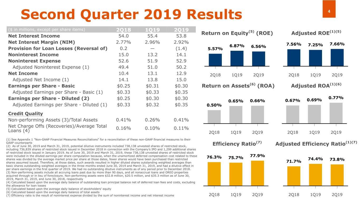 Appendix 1 16 Non-GAAP Financial Measures Reconciliations The following table sets forth selected financial information derived from the Company’s interim unaudited consolidated financial statements, adjusted for certain costs incurred by the Company in the periods presented related primarily to non-deductible spin-off and tax deductible restructuring costs. The Company believes these adjusted numbers are useful to understand the Company’s performance absent these transactions and events. Three Months Ended, ($ in thousands, except per share amounts and percentages) June 30, March 31, June 30, 2019 2019 2018 Total noninterest expenses $ 52,905 $ 51,945 $ 52,638 Less: restructuring costs (1): Staff reduction costs 907 — — Rebranding costs 1,829 933 — Total restructuring costs $ 2,736 $ 933 $ — Less spin-off costs: Legal fees — — 2,000 Additional contribution to non-qualified deferred compensation plan on behalf of participants to mitigate tax effects of unexpected early distribution due to spin-off (2) — — 1,200 Total spin-off costs $ — $ — $ 3,200 Adjusted noninterest expenses $ 50,169 $ 51,012 $ 49,438