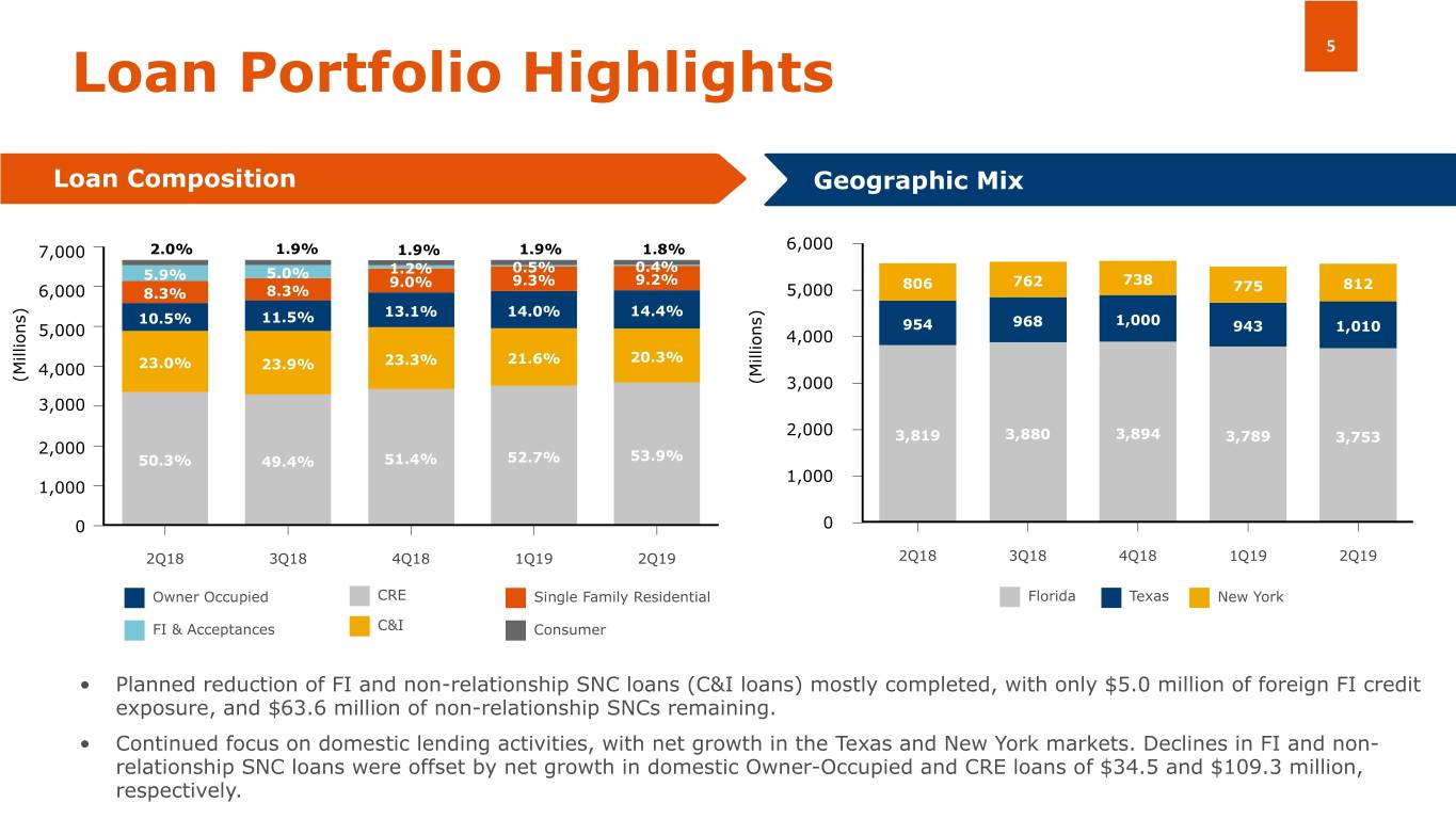 Second Quarter 2019 Results 4 ($ in millions, except per share items) 2Q18 1Q19 2Q19 Return on Equity(5) (ROE) Adjusted ROE(1)(5) Net Interest Income 54.0 55.4 53.8 Net Interest Margin (NIM) 2.77% 2.96% 2.92% 7.56% 7.66% 6.87% 6.56% 7.25% Provision for Loan Losses (Reversal of) 0.2 — (1.4) 5.57% Noninterest Income 15.0 13.2 14.1 Noninterest Expense 52.6 51.9 52.9 Adjusted Noninterest Expense (1) 49.4 51.0 50.2 Net Income 10.4 13.1 12.9 2Q18 1Q19 2Q19 2Q18 1Q19 2Q19 Adjusted Net Income (1) 14.1 13.8 15.0 Earnings per Share - Basic $0.25 $0.31 $0.30 Return on Assets(6) (ROA) Adjusted ROA(1)(6) Adjusted Earnings per Share - Basic (1) $0.33 $0.33 $0.35 Earnings per Share - Diluted (2) $0.25 $0.30 $0.30 0.77% 0.65% 0.66% 0.67% 0.69% Adjusted Earnings per Share - Diluted (1) $0.33 $0.32 $0.35 0.50% Credit Quality Non-performing Assets (3)/Total Assets 0.41% 0.26% 0.41% Net Charge Offs (Recoveries)/Average Total 0.16% 0.10% 0.11% Loans (4) 2Q18 1Q19 2Q19 2Q18 1Q19 2Q19 (1) See Appendix 1 "Non-GAAP Financial Measures Reconciliations" for a reconciliation of these non-GAAP financial measures to their GAAP counterparts (7) (1)(7) (2) As of June 30, 2019 and March 31, 2019, potential dilutive instruments included 738,138 unvested shares of restricted stock, Efficiency Ratio Adjusted Efficiency Ratio including 736,839 shares of restricted stock issued in December 2018 in connection with the Company’s IPO and 1,299 additional shares of restricted stock issued in January 2019. As of June 30, 2019 and March 31, 2019, these 738,138 unvested shares of restricted stock were included in the diluted earnings per share computation because, when the unamortized deferred compensation cost related to these 76.3% 77.9% shares was divided by the average market price per share at those dates, fewer shares would have been purchased than restricted 75.7% 74.4% 73.8% shares assumed issued. Therefore, at those dates, such awards resulted in higher diluted shares outstanding weighted averages than 71.7% basic shares outstanding weighted averages in the three months ended June 30, 2019 and March 31, 2019, and had a dilutive effect in per share earnings in the first quarter of 2019. We had no outstanding dilutive instruments as of any period prior to December 2018. (3) Non-performing assets include all accruing loans past due by more than 90 days, and all nonaccrual loans and OREO properties acquired through or in lieu of foreclosure. Non-performing assets were $32.8 million, $20.5 million, and $35.3 million as of June 30, 2019, March 31, 2019, and June 30, 2018, respectively (4) Calculated based upon the average daily balance of outstanding loan principal balance net of deferred loan fees and costs, excluding the allowance for loan losses (5) Calculated based upon the average daily balance of stockholders' equity (6) Calculated based upon the average daily balance of total assets (7) Efficiency ratio is the result of noninterest expense divided by the sum of noninterest income and net interest income 2Q18 1Q19 2Q19 2Q18 1Q19 2Q19
