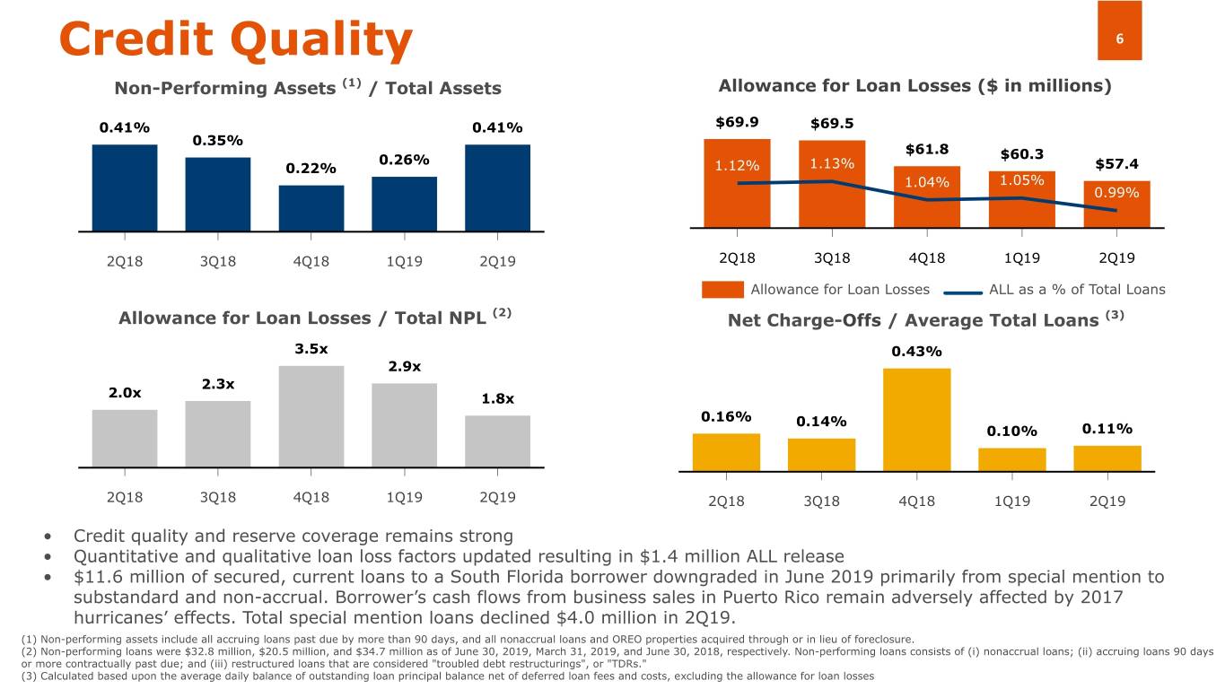 5 Loan Portfolio Highlights Loan Composition Geographic Mix (Domestic) 6,000 7,000 2.0% 1.9% 1.9% 1.9% 1.8% 0.5% 0.4% 5.9% 5.0% 1.2% 9.0% 9.3% 9.2% 806 762 738 775 812 6,000 8.3% 8.3% 5,000 13.1% 14.0% 14.4% 10.5% 11.5% 954 968 1,000 943 1,010 5,000 4,000 23.3% 21.6% 20.3% 4,000 23.0% 23.9% (Millions) (Millions) 3,000 3,000 1.9% 2,000 3,819 3,880 3,894 3,789 3,753 2,000 50.3% 49.4% 51.4% 52.7% 53.9% 1,000 1,000 0 0 2Q18 3Q18 4Q18 1Q19 2Q19 2Q18 3Q18 4Q18 1Q19 2Q19 Owner Occupied CRE Single Family Residential Florida Texas New York FI & Acceptances C&I Consumer • Planned reduction of FI and non-relationship SNC loans (C&I loans) mostly completed, with only $5.0 million of foreign FI credit exposure, and $63.6 million of non-relationship SNCs remaining. • Continued focus on domestic lending activities, with net growth in the Texas and New York markets. Declines in FI and non- relationship SNC loans were offset by net growth in domestic Owner-Occupied and CRE loans of $34.5 and $109.3 million, respectively.