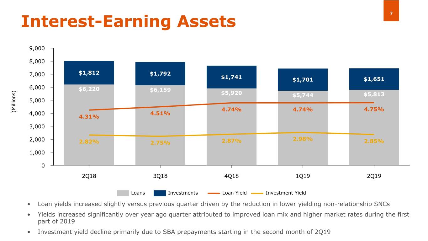 Credit Quality 6 Non-Performing Assets (1) / Total Assets Allowance for Loan Losses ($ in millions) 0.41% 0.41% $69.9 $69.5 0.35% $61.8 0.26% $60.3 0.22% 1.12% 1.13% $57.4 1.04% 1.05% 0.99% 2Q18 3Q18 4Q18 1Q19 2Q19 2Q18 3Q18 4Q18 1Q19 2Q19 Allowance for Loan Losses ALL as a % of Total Loans Allowance for Loan Losses / Total NPL (2) Net Charge-Offs / Average Total Loans (3) 3.5x 0.43% 2.9x 2.3x 2.0x 1.8x 0.16% 0.14% 0.10% 0.11% 2Q18 3Q18 4Q18 1Q19 2Q19 2Q18 3Q18 4Q18 1Q19 2Q19 • Credit quality and reserve coverage remains strong • Quantitative and qualitative loan loss factors updated resulting in $1.4 million ALL release • $11.6 million of secured, current loans to a South Florida borrower downgraded in June 2019 primarily from special mention to substandard and non-accrual. Borrower’s cash flows from business sales in Puerto Rico remain adversely affected by 2017 hurricanes’ effects. Total special mention loans declined $4.0 million in 2Q19. (1) Non-performing assets include all accruing loans past due by more than 90 days, and all nonaccrual loans and OREO properties acquired through or in lieu of foreclosure. (2) Non-performing loans were $32.8 million, $20.5 million, and $34.7 million as of June 30, 2019, March 31, 2019, and June 30, 2018, respectively. Non-performing loans consists of (i) nonaccrual loans; (ii) accruing loans 90 days or more contractually past due; and (iii) restructured loans that are considered "troubled debt restructurings", or "TDRs." (3) Calculated based upon the average daily balance of outstanding loan principal balance net of deferred loan fees and costs, excluding the allowance for loan losses