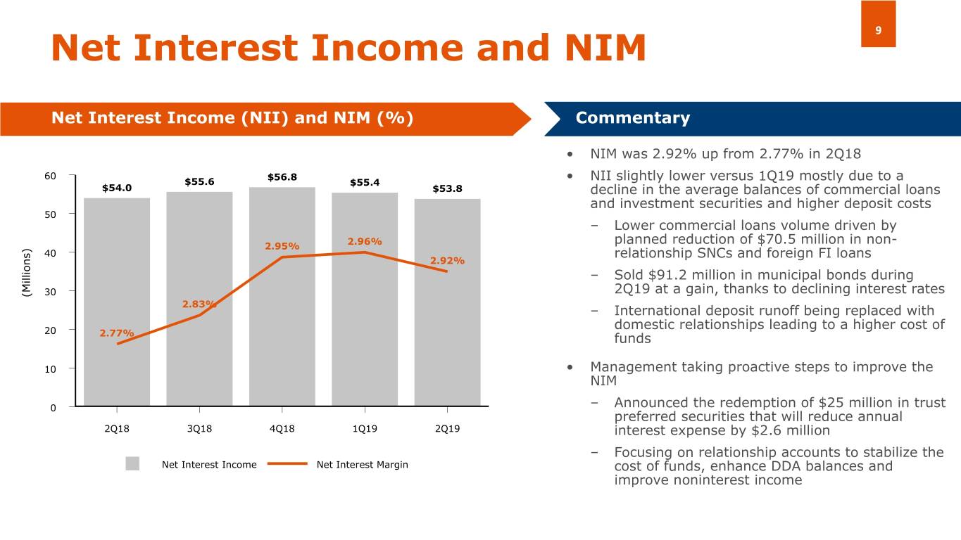 8 Deposit Highlights Deposit Composition Mix by Country of Domicile 7,000 International Deposits $6,363 ($ in millions) $6,189 $6,033 $5,888 ~13% Compound Annual Decline 6,000 $738 $5,819 $643 $642 $589 $619 $1,714 $1,736 $1,745 5,000 $1,770 $1,721 CDs $4,490 $4,093 $3,500 $3,031 $2,805 48% 4,000 1.36% ] (Millions) 1.28% 1.20% 1.12% 3,000 2015 2016 2017 2018 2Q19 0.99% Domestic Deposits 2,000 $3,911 $3,810 $3,646 $3,529 $3,479 ($ in millions) ~12% CAGR 1,000 0 52% $2,484 $2,823 $3,001 $3,014 2Q18 3Q18 4Q18 1Q19 2Q19 $2,030 Transaction Deposits (Core) Customer CDs 2015 2016 2017 2018 2Q19 Brokered CDs Cost of Deposits • Total deposits down on lower core balances from international customers partially offset by growth in domestic commercial relationship core deposits on execution of our strategy • Annualized international deposit run-off rates remains in low teens • Cost of interest bearing deposits up 8bps versus prior quarter due to higher rates in relationship money market accounts and renewing CDs • Seeking to reduce international deposit decline, and focusing efforts on capturing domestic share, in each case through relationship driven products
