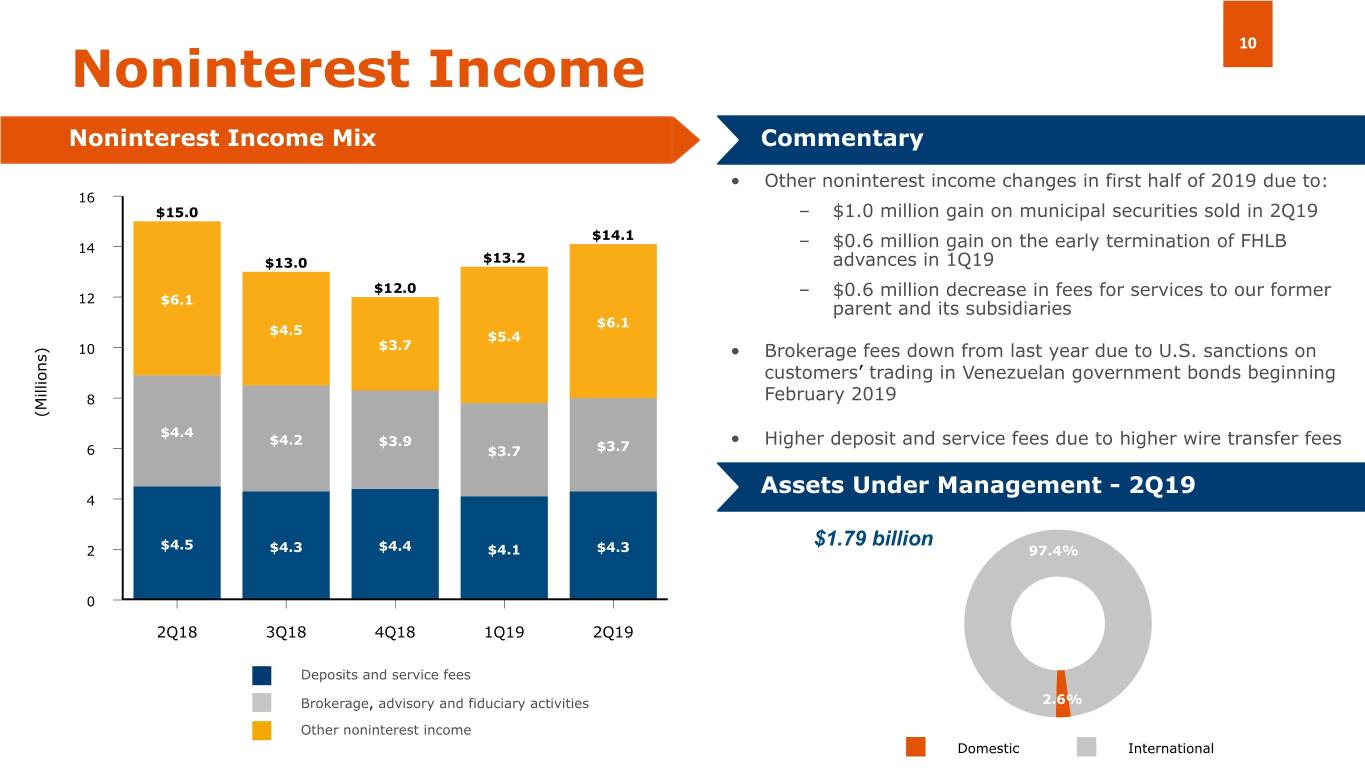 9 Net Interest Income and NIM Net Interest Income (NII) and NIM (%) Commentary • NIM was 2.92% up from 2.77% in 2Q18 60 $56.8 $55.6 $55.4 • NII slightly lower versus 1Q19 mostly due to a $54.0 $53.8 decline in the average balances of commercial loans and investment securities and higher deposit costs 50 – Lower commercial loans volume driven by 2.96% planned reduction of $70.5 million in non- 2.95% 40 relationship SNCs and foreign FI loans 2.92% – Sold $91.2 million in municipal bonds during 30 2Q19 at a gain, thanks to declining interest rates (Millions) 2.83% – International deposit runoff being replaced with 20 domestic relationships leading to a higher cost of 2.77% funds 10 • Management taking proactive steps to improve the NIM 0 – Announced the redemption of $25 million in trust preferred securities that will reduce annual 2Q18 3Q18 4Q18 1Q19 2Q19 interest expense by $2.6 million – Focusing on relationship accounts to stabilize the Net Interest Income Net Interest Margin cost of funds, enhance DDA balances and improve noninterest income
