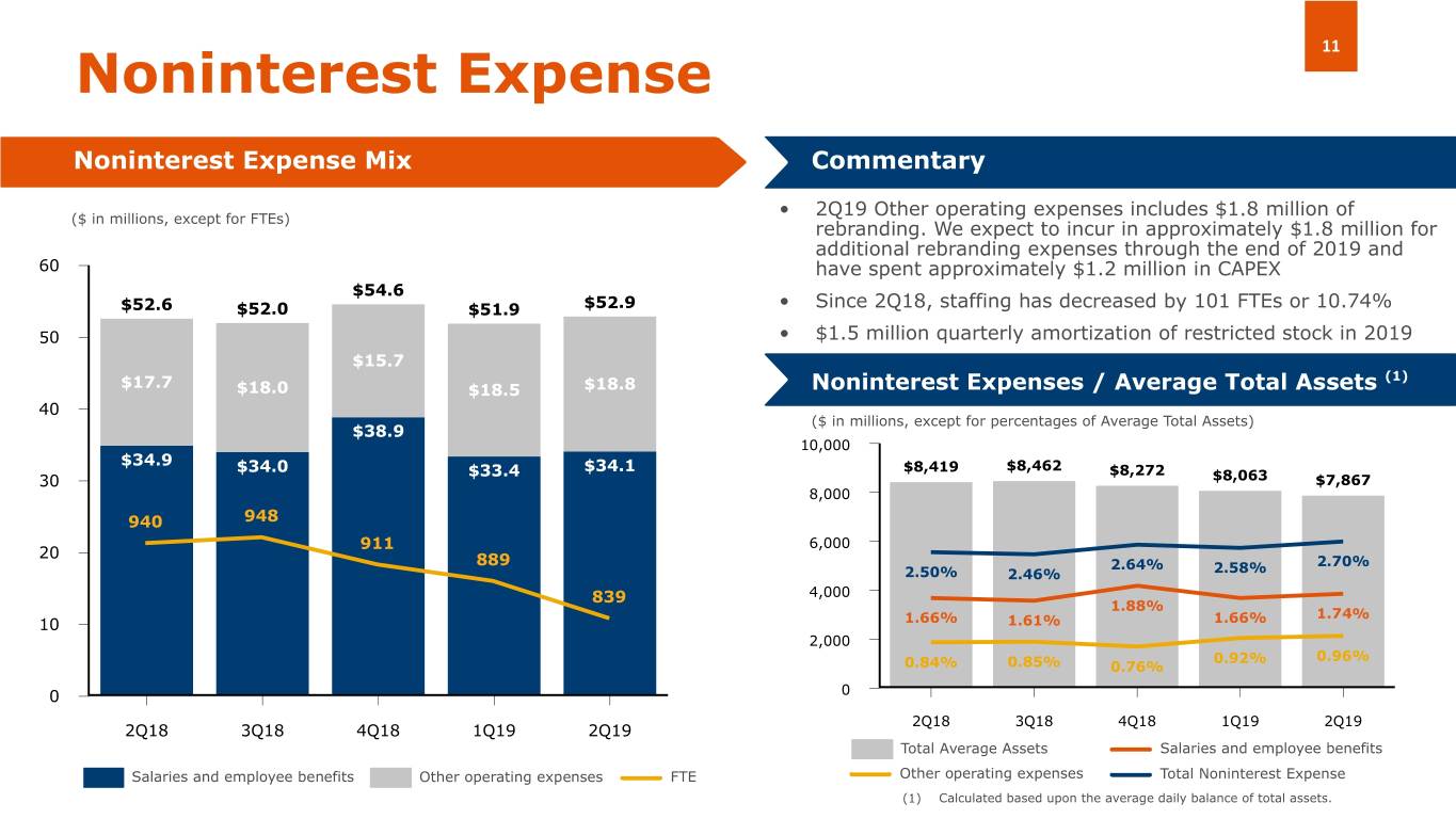 10 Noninterest Income Noninterest Income Mix Commentary • Other noninterest income changes in first half of 2019 due to: 16 $15.0 – $1.0 million gain on municipal securities sold in 2Q19 $14.1 14 – $0.6 million gain on the early termination of FHLB $13.0 $13.2 advances in 1Q19 $12.0 12 – $0.6 million decrease in fees for services to our former $6.1 parent and its subsidiaries $6.1 $4.5 $5.4 10 $3.7 • Brokerage fees down from last year due to U.S. sanctions on customers’ trading in Venezuelan government bonds beginning 8 February 2019 (Millions) $4.4 $4.2 $3.9 • Higher deposit and service fees due to higher wire transfer fees 6 $3.7 $3.7 Assets Under Management - 2Q19 4 $1.79 billion 2 $4.5 $4.3 $4.4 $4.1 $4.3 97.4% 0 2Q18 3Q18 4Q18 1Q19 2Q19 Deposits and service fees Brokerage, advisory and fiduciary activities 2.6% Other noninterest income Domestic International