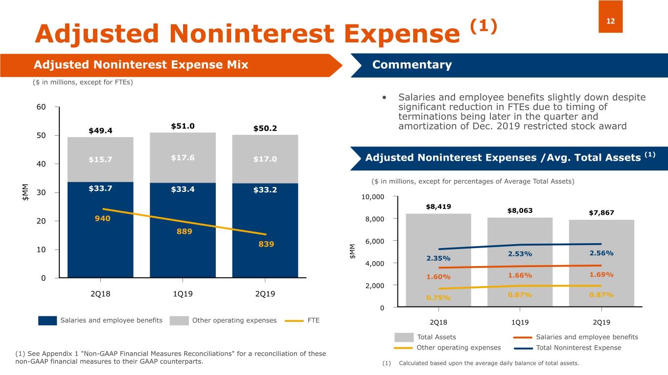 11 Noninterest Expense Noninterest Expense Mix Commentary • 2Q19 Other operating expenses includes $1.8 million of ($ in millions, except for FTEs) rebranding. We expect to incur in approximately $1.8 million for additional rebranding expenses through the end of 2019 and 60 have spent approximately $1.2 million in CAPEX $54.6 $52.6 $52.0 $51.9 $52.9 • Since 2Q18, staffing has decreased by 101 FTEs or 10.74% 50 • $1.5 million quarterly amortization of restricted stock in 2019 $15.7 (1) $17.7 $18.0 $18.5 $18.8 Noninterest Expenses / Average Total Assets 40 ($ in millions, except for percentages of Average Total Assets) $38.9 10,000 $34.9 $34.0 $33.4 $34.1 $8,419 $8,462 $8,272 30 $8,063 $7,867 8,000 940 948 911 6,000 20 889 2.64% 2.70% 2.50% 2.46% 2.58% 839 4,000 1.88% 1.74% 10 1.66% 1.61% 1.66% 2,000 0.92% 0.96% 0.84% 0.85% 0.76% 0 0 2Q18 3Q18 4Q18 1Q19 2Q19 2Q18 3Q18 4Q18 1Q19 2Q19 Total Average Assets Salaries and employee benefits Salaries and employee benefits Other operating expenses FTE Other operating expenses Total Noninterest Expense (1) Calculated based upon the average daily balance of total assets.