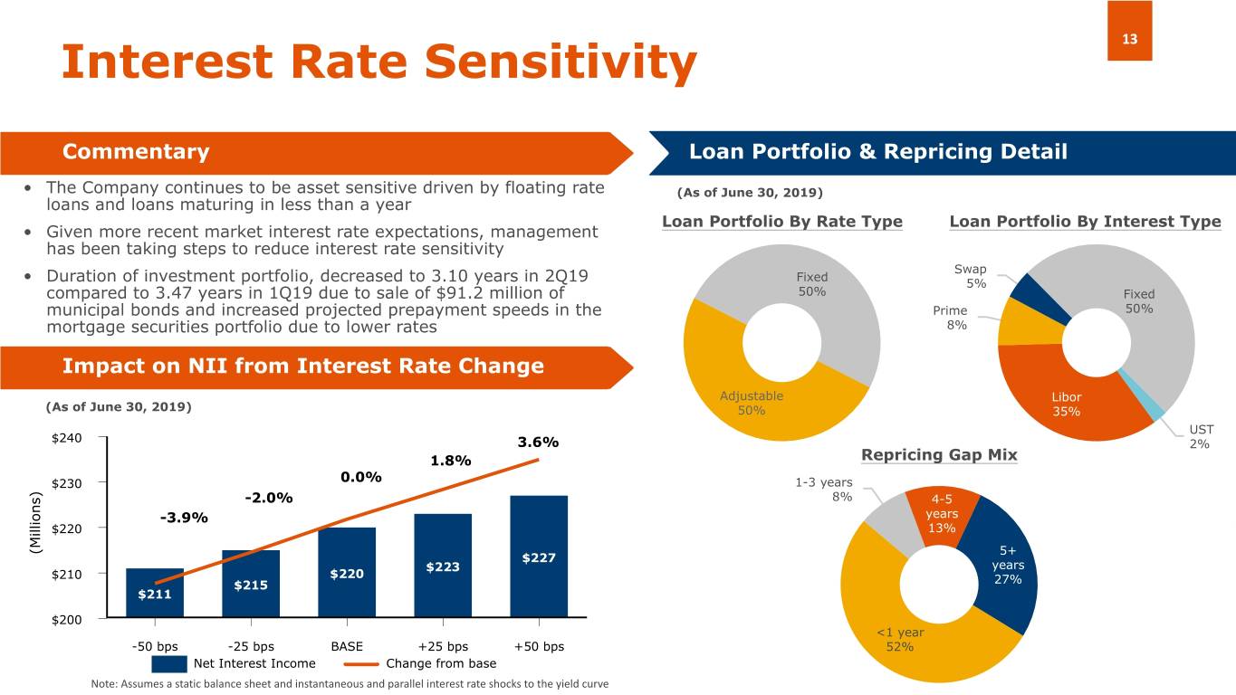 12 Adjusted Noninterest Expense (1) Adjusted Noninterest Expense Mix Commentary ($ in millions, except for FTEs) • Salaries and employee benefits slightly down despite 60 significant reduction in FTEs due to timing of terminations being later in the quarter and $51.0 $49.4 $50.2 amortization of Dec. 2019 restricted stock award 50 (1) $15.7 $17.6 $17.0 Adjusted Noninterest Expenses /Avg. Total Assets 40 ($ in millions, except for percentages of Average Total Assets) M $33.7 $33.4 $33.2 M 30 10,000 $ $8,419 $8,063 $7,867 20 940 8,000 889 839 6,000 10 M M 2.53% 2.56% $ 2.35% 4,000 0 1.60% 1.66% 1.69% 2,000 2Q18 1Q19 2Q19 0.75% 0.87% 0.87% 0 Salaries and employee benefits Other operating expenses FTE 2Q18 1Q19 2Q19 Total Assets Salaries and employee benefits Other operating expenses Total Noninterest Expense (1) See Appendix 1 "Non-GAAP Financial Measures Reconciliations" for a reconciliation of these non-GAAP financial measures to their GAAP counterparts. (1) Calculated based upon the average daily balance of total assets.