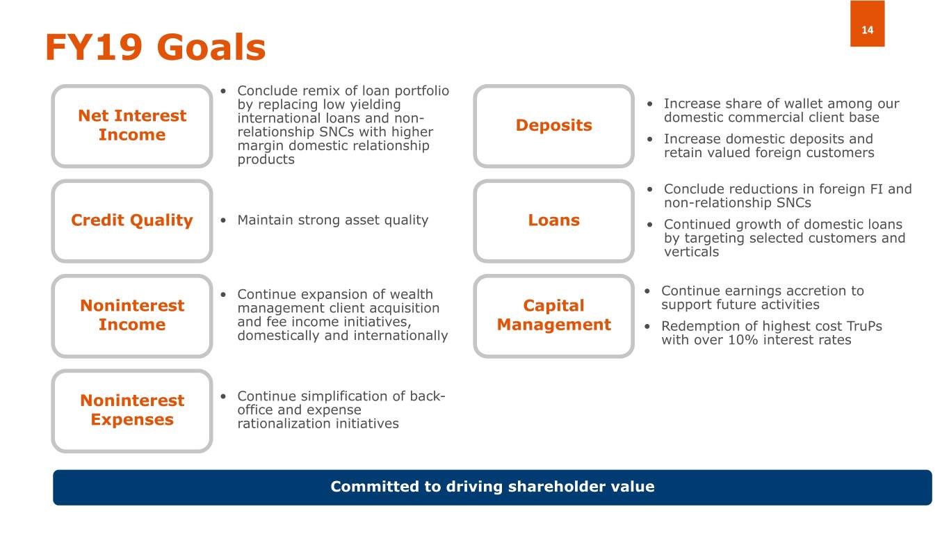14 FY19 Goals • Conclude remix of loan portfolio by replacing low yielding • Increase share of wallet among our Net Interest international loans and non- domestic commercial client base relationship SNCs with higher Deposits Income • Increase domestic deposits and margin domestic relationship retain valued foreign customers products • Conclude reductions in foreign FI and non-relationship SNCs Credit Quality • Maintain strong asset quality Loans • Continued growth of domestic loans by targeting selected customers and verticals • Continue expansion of wealth • Continue earnings accretion to Noninterest management client acquisition Capital support future activities Income and fee income initiatives, Management • Redemption of highest cost TruPs domestically and internationally with over 10% interest rates Noninterest • Continue simplification of back- office and expense Expenses rationalization initiatives Committed to driving shareholder value