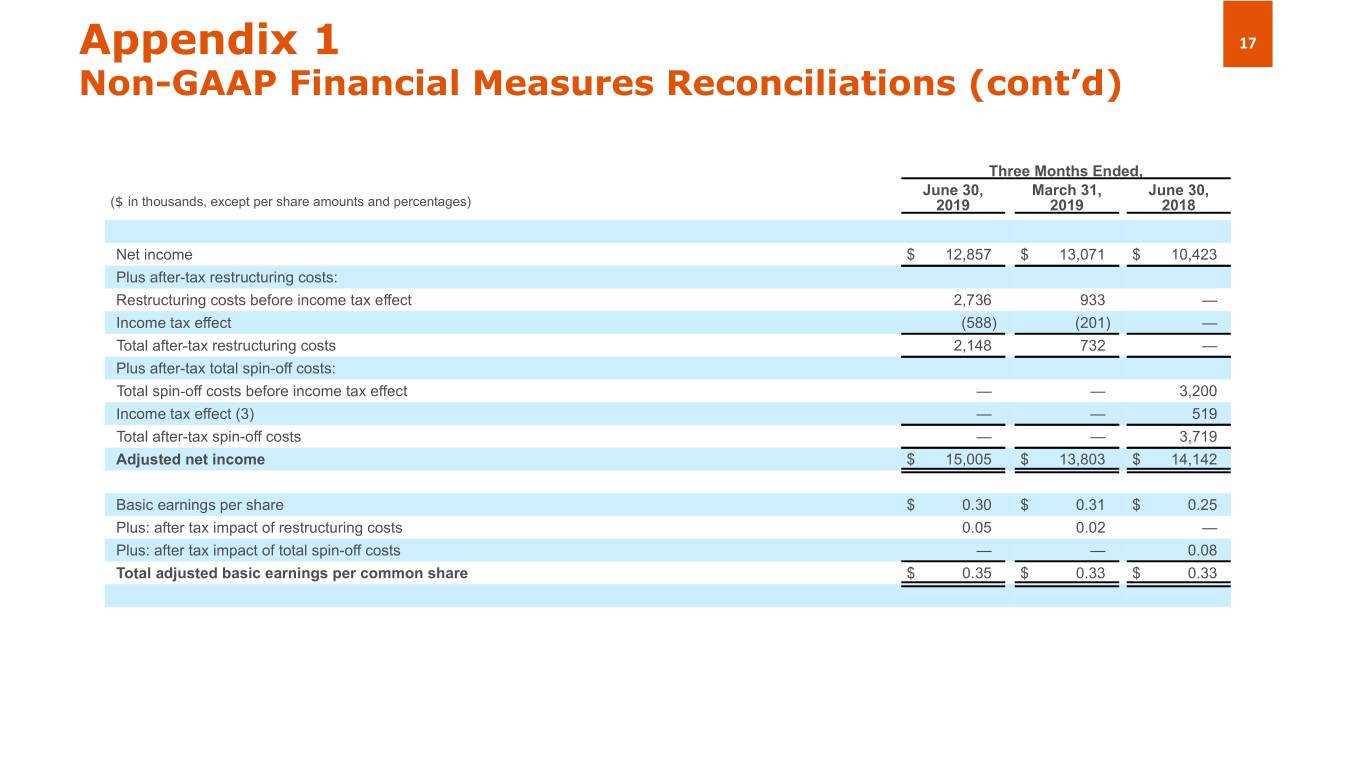 Appendix 1 17 Non-GAAP Financial Measures Reconciliations (cont’d) Three Months Ended, June 30, March 31, June 30, ($ in thousands, except per share amounts and percentages) 2019 2019 2018 Net income $ 12,857 $ 13,071 $ 10,423 Plus after-tax restructuring costs: Restructuring costs before income tax effect 2,736 933 — Income tax effect (588) (201) — Total after-tax restructuring costs 2,148 732 — Plus after-tax total spin-off costs: Total spin-off costs before income tax effect — — 3,200 Income tax effect (3) — — 519 Total after-tax spin-off costs — — 3,719 Adjusted net income $ 15,005 $ 13,803 $ 14,142 Basic earnings per share $ 0.30 $ 0.31 $ 0.25 Plus: after tax impact of restructuring costs 0.05 0.02 — Plus: after tax impact of total spin-off costs — — 0.08 Total adjusted basic earnings per common share $ 0.35 $ 0.33 $ 0.33