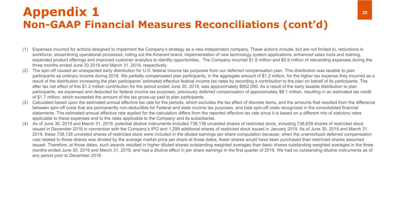 Appendix 1 18 Non-GAAP Financial Measures Reconciliations (cont’d) Three Months Ended, June 30, March 31, June 30, ($ in thousands, except per share amounts and percentages) 2019 2019 2018 Diluted earnings per share (4) $ 0.30 $ 0.30 $ 0.25 Plus: after tax impact of restructuring costs 0.05 0.02 — Plus: after tax impact of total spin-off costs — — 0.08 Total adjusted diluted earnings per common share $ 0.35 $ 0.32 $ 0.33 Net income / Average total assets (ROA) 0.66 % 0.65 % 0.50 % Plus: after tax impact of restructuring costs 0.11 % 0.04 % — % Plus: after tax impact of total spin-off costs — % — % 0.17 % Adjusted net income / Average total assets (Adjusted ROA) 0.77 % 0.69 % 0.67 % Net income / Average stockholders' equity (ROE) 6.56 % 6.87 % 5.57 % Plus: after tax impact of restructuring costs 1.10 % 0.38 % —% Plus: after tax impact of total spin-off costs — % — % 1.99 % Adjusted net income / Stockholders' equity (Adjusted ROE) 7.66 % 7.25 % 7.56 %