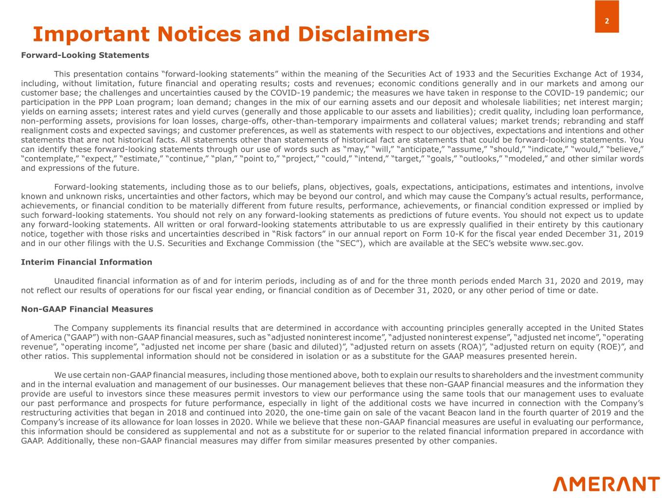 2 Important Notices and Disclaimers Forward-Looking Statements This presentation contains “forward-looking statements” within the meaning of the Securities Act of 1933 and the Securities Exchange Act of 1934, including, without limitation, future financial and operating results; costs and revenues; economic conditions generally and in our markets and among our customer base; the challenges and uncertainties caused by the COVID-19 pandemic; the measures we have taken in response to the COVID-19 pandemic; our participation in the PPP Loan program; loan demand; changes in the mix of our earning assets and our deposit and wholesale liabilities; net interest margin; yields on earning assets; interest rates and yield curves (generally and those applicable to our assets and liabilities); credit quality, including loan performance, non-performing assets, provisions for loan losses, charge-offs, other-than-temporary impairments and collateral values; market trends; rebranding and staff realignment costs and expected savings; and customer preferences, as well as statements with respect to our objectives, expectations and intentions and other statements that are not historical facts. All statements other than statements of historical fact are statements that could be forward-looking statements. You can identify these forward-looking statements through our use of words such as “may,” “will,” “anticipate,” “assume,” “should,” “indicate,” “would,” “believe,” “contemplate,” “expect,” “estimate,” “continue,” “plan,” “point to,” “project,” “could,” “intend,” “target,” “goals,” “outlooks,” “modeled,” and other similar words and expressions of the future. Forward-looking statements, including those as to our beliefs, plans, objectives, goals, expectations, anticipations, estimates and intentions, involve known and unknown risks, uncertainties and other factors, which may be beyond our control, and which may cause the Company’s actual results, performance, achievements, or financial condition to be materially different from future results, performance, achievements, or financial condition expressed or implied by such forward-looking statements. You should not rely on any forward-looking statements as predictions of future events. You should not expect us to update any forward-looking statements. All written or oral forward-looking statements attributable to us are expressly qualified in their entirety by this cautionary notice, together with those risks and uncertainties described in “Risk factors” in our annual report on Form 10-K for the fiscal year ended December 31, 2019 and in our other filings with the U.S. Securities and Exchange Commission (the “SEC”), which are available at the SEC’s website www.sec.gov. Interim Financial Information Unaudited financial information as of and for interim periods, including as of and for the three month periods ended March 31, 2020 and 2019, may not reflect our results of operations for our fiscal year ending, or financial condition as of December 31, 2020, or any other period of time or date. Non-GAAP Financial Measures The Company supplements its financial results that are determined in accordance with accounting principles generally accepted in the United States of America (“GAAP”) with non-GAAP financial measures, such as “adjusted noninterest income”, “adjusted noninterest expense”, “adjusted net income”, “operating revenue”, “operating income”, “adjusted net income per share (basic and diluted)”, “adjusted return on assets (ROA)”, “adjusted return on equity (ROE)”, and other ratios. This supplemental information should not be considered in isolation or as a substitute for the GAAP measures presented herein. We use certain non-GAAP financial measures, including those mentioned above, both to explain our results to shareholders and the investment community and in the internal evaluation and management of our businesses. Our management believes that these non-GAAP financial measures and the information they provide are useful to investors since these measures permit investors to view our performance using the same tools that our management uses to evaluate our past performance and prospects for future performance, especially in light of the additional costs we have incurred in connection with the Company’s restructuring activities that began in 2018 and continued into 2020, the one-time gain on sale of the vacant Beacon land in the fourth quarter of 2019 and the Company’s increase of its allowance for loan losses in 2020. While we believe that these non-GAAP financial measures are useful in evaluating our performance, this information should be considered as supplemental and not as a substitute for or superior to the related financial information prepared in accordance with GAAP. Additionally, these non-GAAP financial measures may differ from similar measures presented by other companies.