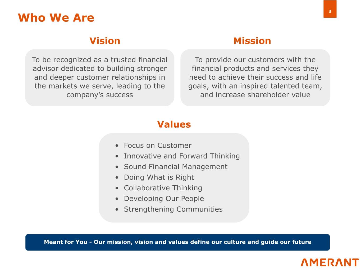 3 Who We Are Vision Mission To be recognized as a trusted financial To provide our customers with the advisor dedicated to building stronger financial products and services they and deeper customer relationships in need to achieve their success and life the markets we serve, leading to the goals, with an inspired talented team, company’s success and increase shareholder value Values • Focus on Customer • Innovative and Forward Thinking • Sound Financial Management • Doing What is Right • Collaborative Thinking • Developing Our People • Strengthening Communities Meant for You - Our mission, vision and values define our culture and guide our future