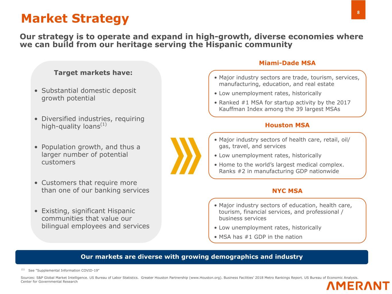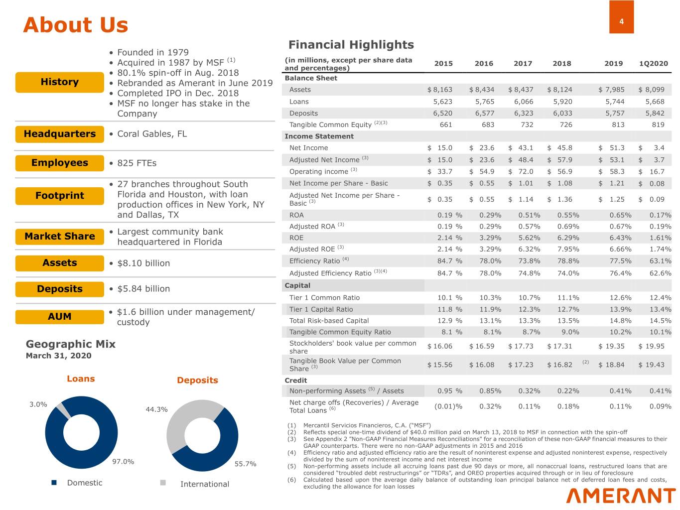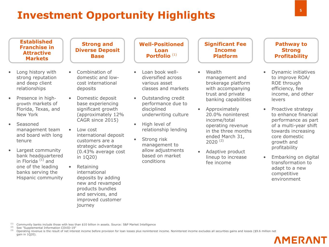 About Us 4 Financial Highlights • Founded in 1979 (1) (in millions, except per share data • Acquired in 1987 by MSF 2015 2016 2017 2018 2019 1Q2020 and percentages) • 80.1% spin-off in Aug. 2018 Balance Sheet History • Rebranded as Amerant in June 2019 • Completed IPO in Dec. 2018 Assets $ 8,163 $ 8,434 $ 8,437 $ 8,124 $ 7,985 $ 8,099 • MSF no longer has stake in the Loans 5,623 5,765 6,066 5,920 5,744 5,668 Company Deposits 6,520 6,577 6,323 6,033 5,757 5,842 Tangible Common Equity (2)(3) 661 683 732 726 813 819 Headquarters • Coral Gables, FL Income Statement Net Income $ 15.0 $ 23.6 $ 43.1 $ 45.8 $ 51.3 $ 3.4 (3) Employees • 825 FTEs Adjusted Net Income $ 15.0 $ 23.6 $ 48.4 $ 57.9 $ 53.1 $ 3.7 Operating income (3) $ 33.7 $ 54.9 $ 72.0 $ 56.9 $ 58.3 $ 16.7 • 27 branches throughout South Net Income per Share - Basic $ 0.35 $ 0.55 $ 1.01 $ 1.08 $ 1.21 $ 0.08 Florida and Houston, with loan Adjusted Net Income per Share - Footprint $ 0.35 $ 0.55 $ 1.14 $ 1.36 $ 1.25 $ 0.09 production offices in New York, NY Basic (3) and Dallas, TX ROA 0.19 % 0.29% 0.51% 0.55% 0.65% 0.17% Adjusted ROA (3) 0.19 % 0.29% 0.57% 0.69% 0.67% 0.19% Market Share • Largest community bank headquartered in Florida ROE 2.14 % 3.29% 5.62% 6.29% 6.43% 1.61% Adjusted ROE (3) 2.14 % 3.29% 6.32% 7.95% 6.66% 1.74% (4) Assets • $8.10 billion Efficiency Ratio 84.7 % 78.0% 73.8% 78.8% 77.5% 63.1% Adjusted Efficiency Ratio (3)(4) 84.7 % 78.0% 74.8% 74.0% 76.4% 62.6% Deposits • $5.84 billion Capital Tier 1 Common Ratio 10.1 % 10.3% 10.7% 11.1% 12.6% 12.4% Tier 1 Capital Ratio 11.8 % 11.9% 12.3% 12.7% 13.9% 13.4% AUM • $1.6 billion under management/ custody Total Risk-based Capital 12.9 % 13.1% 13.3% 13.5% 14.8% 14.5% Tangible Common Equity Ratio 8.1 % 8.1% 8.7% 9.0% 10.2% 10.1% Geographic Mix Stockholders' book value per common $ 16.06 $ 16.59 $ 17.73 $ 17.31 $ 19.35 $ 19.95 share March 31, 2020 Tangible Book Value per Common (2) $ 15.56 $ 16.08 $ 17.23 $ 16.82 $ 18.84 $ 19.43 Share (3) Loans Deposits Credit Non-performing Assets (5) / Assets 0.95 % 0.85% 0.32% 0.22% 0.41% 0.41% Net charge offs (Recoveries) / Average 3.0% (0.01)% 0.32% 0.11% 0.18% 0.11% 0.09% 44.3% Total Loans (6) (1) Mercantil Servicios Financieros, C.A. (“MSF”) (2) Reflects special one-time dividend of $40.0 million paid on March 13, 2018 to MSF in connection with the spin-off (3) See Appendix 2 ”Non-GAAP Financial Measures Reconciliations" for a reconciliation of these non-GAAP financial measures to their GAAP counterparts. There were no non-GAAP adjustments in 2015 and 2016 (4) Efficiency ratio and adjusted efficiency ratio are the result of noninterest expense and adjusted noninterest expense, respectively 97.0% divided by the sum of noninterest income and net interest income 55.7% (5) Non-performing assets include all accruing loans past due 90 days or more, all nonaccrual loans, restructured loans that are considered “troubled debt restructurings” or “TDRs”, and OREO properties acquired through or in lieu of foreclosure § § (6) Calculated based upon the average daily balance of outstanding loan principal balance net of deferred loan fees and costs, Domestic International excluding the allowance for loan losses