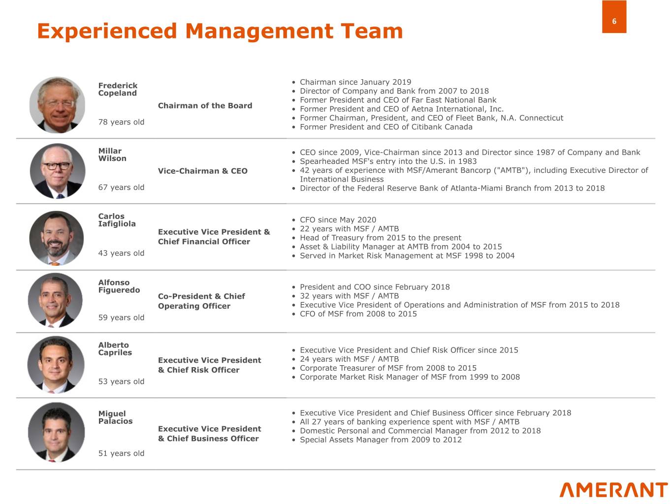 6 Experienced Management Team Frederick • Chairman since January 2019 Copeland • Director of Company and Bank from 2007 to 2018 • Former President and CEO of Far East National Bank Chairman of the Board • Former President and CEO of Aetna International, Inc. • Former Chairman, President, and CEO of Fleet Bank, N.A. Connecticut 78 years old • Former President and CEO of Citibank Canada Millar • CEO since 2009, Vice-Chairman since 2013 and Director since 1987 of Company and Bank Wilson • Spearheaded MSF's entry into the U.S. in 1983 Vice-Chairman & CEO • 42 years of experience with MSF/Amerant Bancorp ("AMTB"), including Executive Director of International Business 67 years old • Director of the Federal Reserve Bank of Atlanta-Miami Branch from 2013 to 2018 Carlos • CFO since May 2020 Iafigliola Executive Vice President & • 22 years with MSF / AMTB • Head of Treasury from 2015 to the present Chief Financial Officer • Asset & Liability Manager at AMTB from 2004 to 2015 43 years old • Served in Market Risk Management at MSF 1998 to 2004 Alfonso Figueredo • President and COO since February 2018 Co-President & Chief • 32 years with MSF / AMTB Operating Officer • Executive Vice President of Operations and Administration of MSF from 2015 to 2018 59 years old • CFO of MSF from 2008 to 2015 Alberto Capriles • Executive Vice President and Chief Risk Officer since 2015 Executive Vice President • 24 years with MSF / AMTB & Chief Risk Officer • Corporate Treasurer of MSF from 2008 to 2015 • Corporate Market Risk Manager of MSF from 1999 to 2008 53 years old Miguel • Executive Vice President and Chief Business Officer since February 2018 Palacios • All 27 years of banking experience spent with MSF / AMTB Executive Vice President • Domestic Personal and Commercial Manager from 2012 to 2018 & Chief Business Officer • Special Assets Manager from 2009 to 2012 51 years old