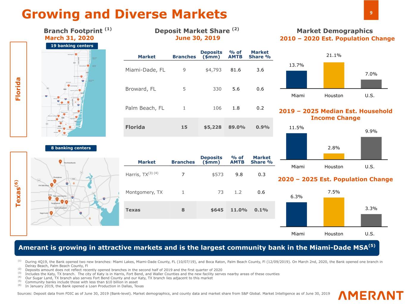 8 Market Strategy Our strategy is to operate and expand in high-growth, diverse economies where we can build from our heritage serving the Hispanic community Miami-Dade MSA Target markets have: • Major industry sectors are trade, tourism, services, manufacturing, education, and real estate • Substantial domestic deposit • Low unemployment rates, historically growth potential • Ranked #1 MSA for startup activity by the 2017 Kauffman Index among the 39 largest MSAs • Diversified industries, requiring high-quality loans(1) Houston MSA • Major industry sectors of health care, retail, oil/ • Population growth, and thus a gas, travel, and services larger number of potential • Low unemployment rates, historically customers • Home to the world’s largest medical complex. Ranks #2 in manufacturing GDP nationwide • Customers that require more than one of our banking services NYC MSA • Major industry sectors of education, health care, • Existing, significant Hispanic tourism, financial services, and professional / communities that value our business services bilingual employees and services • Low unemployment rates, historically • MSA has #1 GDP in the nation Our markets are diverse with growing demographics and industry (1) See "Supplemental Information COVID-19" Sources: S&P Global Market Intelligence. US Bureau of Labor Statistics. Greater Houston Partnership (www.Houston.org). Business Facilities’ 2018 Metro Rankings Report. US Bureau of Economic Analysis. Center for Governmental Research