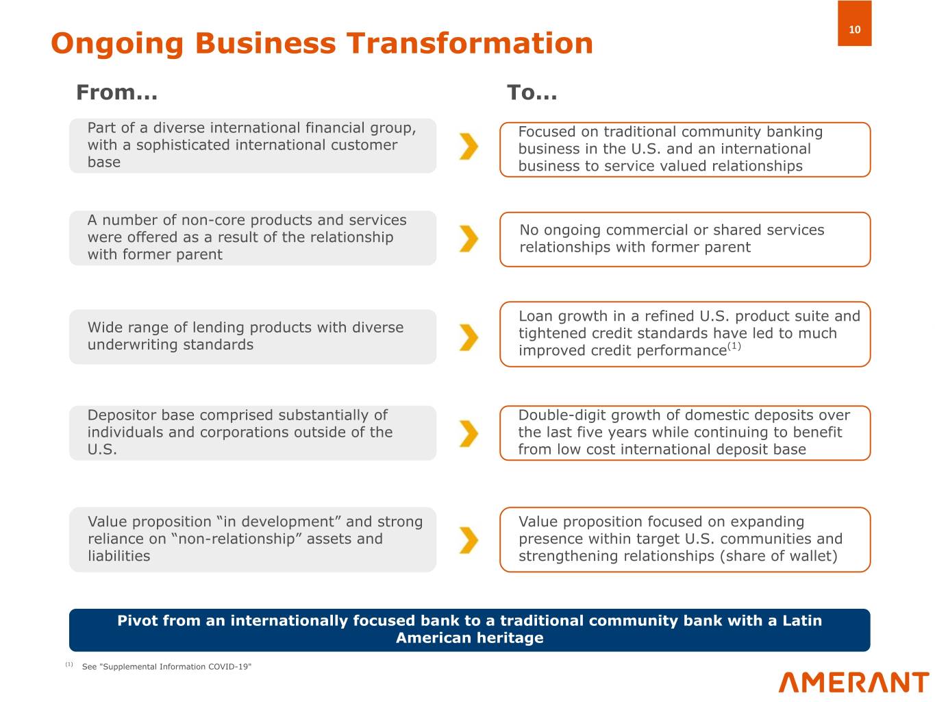 Growing and Diverse Markets 9 Branch Footprint (1) Deposit Market Share (2) Market Demographics March 31, 2020 June 30, 2019 2010 – 2020 Est. Population Change 19 banking centers Deposits % of Market Market Branches ($mm) AMTB Share % 21.1% 13.7% Miami-Dade, FL 9 $4,793 81.6 3.6 7.0% Broward, FL 5 330 5.6 0.6 Miami Houston U.S. Florida Palm Beach, FL 1 106 1.8 0.2 2019 – 2025 Median Est. Household Income Change Florida 15 $5,228 89.0% 0.9% 11.5% 9.9% 8 banking centers 2.8% Deposits % of Market Market Branches ($mm) AMTB Share % Miami Houston U.S. Harris, TX(3) (4) 7 $573 9.8 0.3 2020 – 2025 Est. Population Change (6) Montgomery, TX 1 73 1.2 0.6 7.5% 6.3% Texas Texas 8 $645 11.0% 0.1% 3.3% Miami Houston U.S. Amerant is growing in attractive markets and is the largest community bank in the Miami-Dade MSA(5) (1) During 4Q19, the Bank opened two new branches: Miami Lakes, Miami-Dade County, FL (10/07/19), and Boca Raton, Palm Beach County, Fl (12/09/2019). On March 2nd, 2020, the Bank opened one branch in Delray Beach, Palm Beach County, Fl (2) Deposits amount does not reflect recently opened branches in the second half of 2019 and the first quarter of 2020 (3) Includes the Katy, TX branch. The city of Katy is in Harris, Fort Bend, and Waller Counties and the new facility serves nearby areas of these counties (4) Our Sugar Land, TX branch also serves Fort Bend County and our Katy, TX branch lies adjacent to this market (5) Community banks include those with less than $10 billion in asset (6) In January 2019, the Bank opened a Loan Production in Dallas, Texas Sources: Deposit data from FDIC as of June 30, 2019 (Bank-level). Market demographics, and county data and market share from S&P Global. Market Intelligence as of June 30, 2019