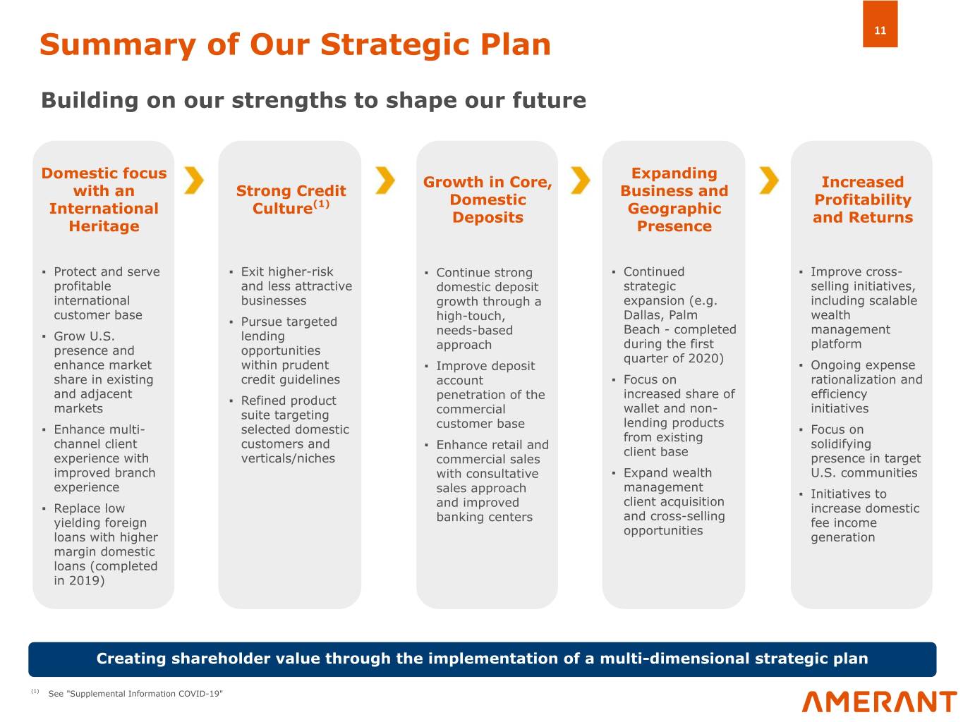 10 Ongoing Business Transformation From... To... Part of a diverse international financial group, Focused on traditional community banking with a sophisticated international customer business in the U.S. and an international base business to service valued relationships A number of non-core products and services No ongoing commercial or shared services were offered as a result of the relationship relationships with former parent with former parent Loan growth in a refined U.S. product suite and Wide range of lending products with diverse tightened credit standards have led to much underwriting standards improved credit performance(1) Depositor base comprised substantially of Double-digit growth of domestic deposits over individuals and corporations outside of the the last five years while continuing to benefit U.S. from low cost international deposit base Value proposition “in development” and strong Value proposition focused on expanding reliance on “non-relationship” assets and presence within target U.S. communities and liabilities strengthening relationships (share of wallet) Pivot from an internationally focused bank to a traditional community bank with a Latin American heritage (1) See "Supplemental Information COVID-19"