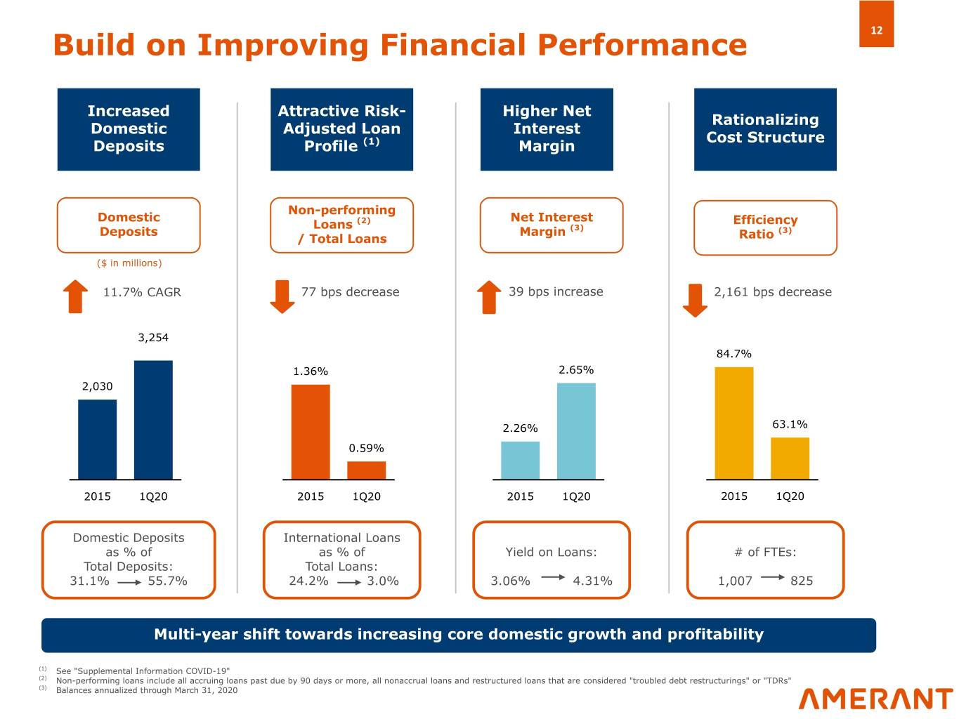 11 Summary of Our Strategic Plan Building on our strengths to shape our future Domestic focus Expanding Growth in Core, Increased with an Strong Credit Business and Domestic Profitability International Culture(1) Geographic Deposits and Returns Heritage Presence ▪ Protect and serve ▪ Exit higher-risk ▪ Continue strong ▪ Continued ▪ Improve cross- profitable and less attractive domestic deposit strategic selling initiatives, international businesses growth through a expansion (e.g. including scalable customer base Dallas, Palm wealth ▪ Pursue targeted high-touch, Beach - completed management ▪ Grow U.S. lending needs-based during the first platform presence and opportunities approach quarter of 2020) enhance market within prudent ▪ Improve deposit ▪ Ongoing expense share in existing credit guidelines account ▪ Focus on rationalization and and adjacent increased share of efficiency ▪ Refined product penetration of the markets wallet and non- initiatives suite targeting commercial lending products ▪ Enhance multi- selected domestic customer base ▪ Focus on from existing channel client customers and ▪ Enhance retail and solidifying client base experience with verticals/niches commercial sales presence in target improved branch with consultative ▪ Expand wealth U.S. communities experience management sales approach ▪ Initiatives to client acquisition ▪ Replace low and improved increase domestic and cross-selling yielding foreign banking centers fee income opportunities loans with higher generation margin domestic loans (completed in 2019) Creating shareholder value through the implementation of a multi-dimensional strategic plan (1) See "Supplemental Information COVID-19"
