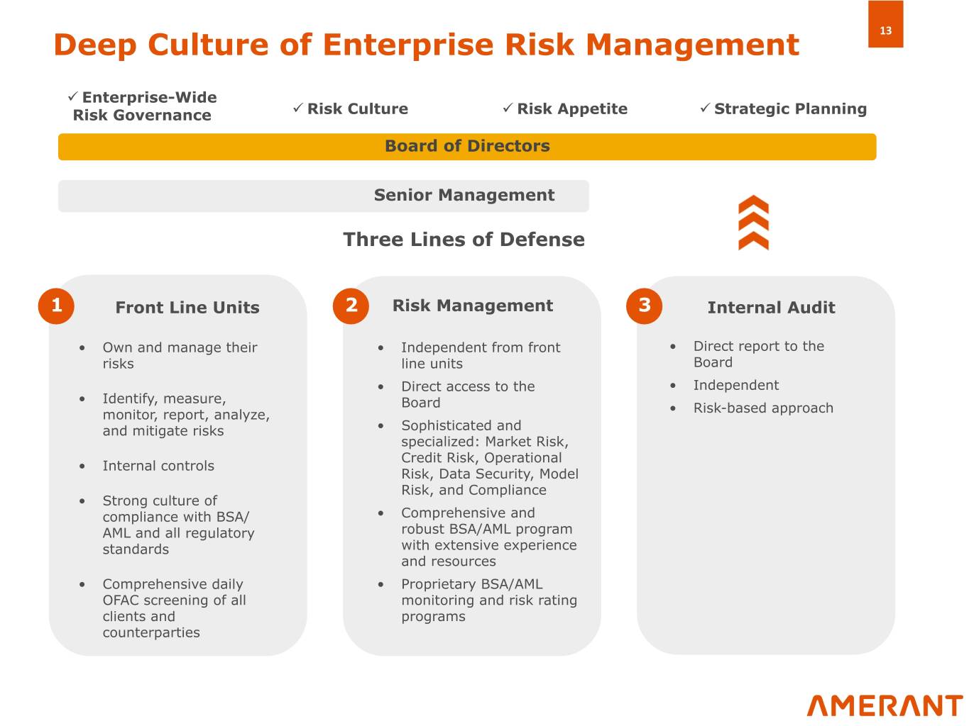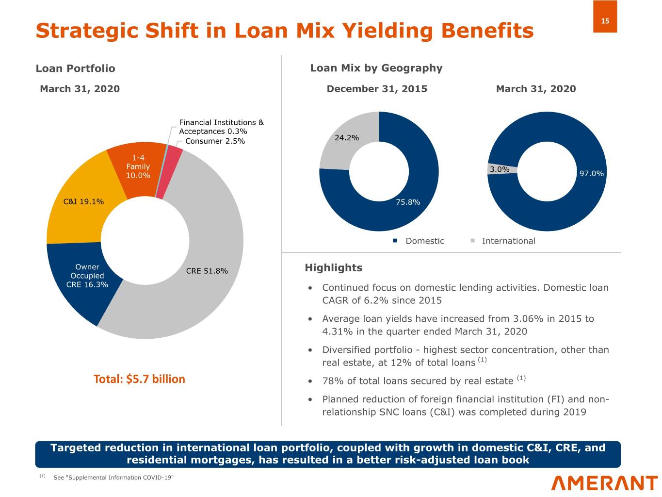 12 Build on Improving Financial Performance Increased Attractive Risk- Higher Net Rationalizing Domestic Adjusted Loan Interest Cost Structure Deposits Profile (1) Margin Non-performing Domestic Net Interest Loans (2) Efficiency Deposits Margin (3) (3) / Total Loans Ratio ($ in millions) 11.7% CAGR 77 bps decrease 39 bps increase 2,161 bps decrease 3,254 84.7% 1.36% 2.65% 2,030 2.26% 63.1% 0.59% 2015 1Q20 2015 1Q20 2015 1Q20 2015 1Q20 Domestic Deposits International Loans as % of as % of Yield on Loans: # of FTEs: Total Deposits: Total Loans: 31.1% 55.7% 24.2% 3.0% 3.06% 4.31% 1,007 825 Multi-year shift towards increasing core domestic growth and profitability (1) See "Supplemental Information COVID-19" (2) Non-performing loans include all accruing loans past due by 90 days or more, all nonaccrual loans and restructured loans that are considered "troubled debt restructurings" or "TDRs" (3) Balances annualized through March 31, 2020