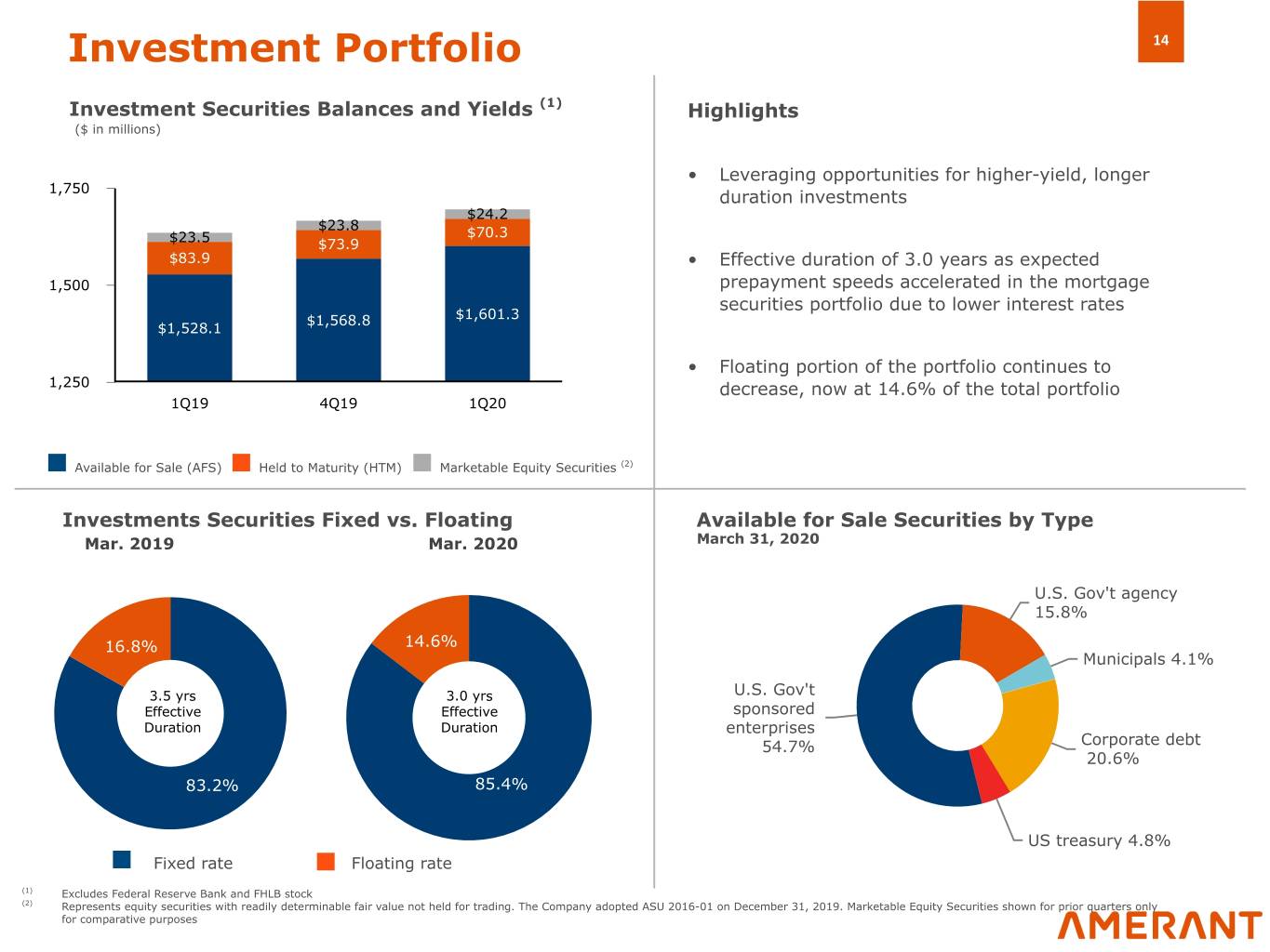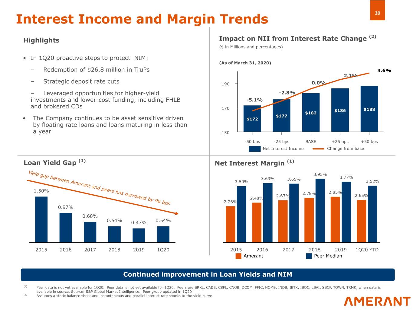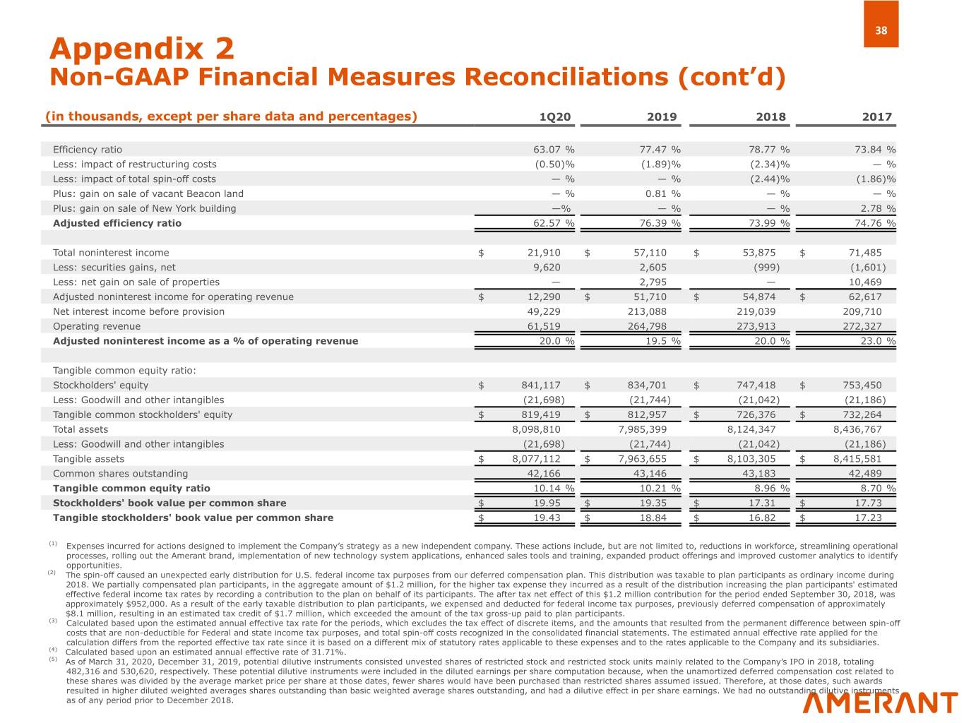 38 Appendix 2 Non-GAAP Financial Measures Reconciliations (cont’d) (in thousands, except per share data and percentages) 1Q20 2019 2018 2017 Efficiency ratio 63.07 % 77.47 % 78.77 % 73.84 % Less: impact of restructuring costs (0.50)% (1.89)% (2.34)% — % Less: impact of total spin-off costs — % — % (2.44)% (1.86)% Plus: gain on sale of vacant Beacon land — % 0.81 % — % — % Plus: gain on sale of New York building —% — % — % 2.78 % Adjusted efficiency ratio 62.57 % 76.39 % 73.99 % 74.76 % Total noninterest income $ 21,910 $ 57,110 $ 53,875 $ 71,485 Less: securities gains, net 9,620 2,605 (999) (1,601) Less: net gain on sale of properties — 2,795 — 10,469 Adjusted noninterest income for operating revenue $ 12,290 $ 51,710 $ 54,874 $ 62,617 Net interest income before provision 49,229 213,088 219,039 209,710 Operating revenue 61,519 264,798 273,913 272,327 Adjusted noninterest income as a % of operating revenue 20.0 % 19.5 % 20.0 % 23.0 % Tangible common equity ratio: Stockholders' equity $ 841,117 $ 834,701 $ 747,418 $ 753,450 Less: Goodwill and other intangibles (21,698) (21,744) (21,042) (21,186) Tangible common stockholders' equity $ 819,419 $ 812,957 $ 726,376 $ 732,264 Total assets 8,098,810 7,985,399 8,124,347 8,436,767 Less: Goodwill and other intangibles (21,698) (21,744) (21,042) (21,186) Tangible assets $ 8,077,112 $ 7,963,655 $ 8,103,305 $ 8,415,581 Common shares outstanding 42,166 43,146 43,183 42,489 Tangible common equity ratio 10.14 % 10.21 % 8.96 % 8.70 % Stockholders' book value per common share $ 19.95 $ 19.35 $ 17.31 $ 17.73 Tangible stockholders' book value per common share $ 19.43 $ 18.84 $ 16.82 $ 17.23 (1) Expenses incurred for actions designed to implement the Company’s strategy as a new independent company. These actions include, but are not limited to, reductions in workforce, streamlining operational processes, rolling out the Amerant brand, implementation of new technology system applications, enhanced sales tools and training, expanded product offerings and improved customer analytics to identify opportunities. (2) The spin-off caused an unexpected early distribution for U.S. federal income tax purposes from our deferred compensation plan. This distribution was taxable to plan participants as ordinary income during 2018. We partially compensated plan participants, in the aggregate amount of $1.2 million, for the higher tax expense they incurred as a result of the distribution increasing the plan participants' estimated effective federal income tax rates by recording a contribution to the plan on behalf of its participants. The after tax net effect of this $1.2 million contribution for the period ended September 30, 2018, was approximately $952,000. As a result of the early taxable distribution to plan participants, we expensed and deducted for federal income tax purposes, previously deferred compensation of approximately $8.1 million, resulting in an estimated tax credit of $1.7 million, which exceeded the amount of the tax gross-up paid to plan participants. (3) Calculated based upon the estimated annual effective tax rate for the periods, which excludes the tax effect of discrete items, and the amounts that resulted from the permanent difference between spin-off costs that are non-deductible for Federal and state income tax purposes, and total spin-off costs recognized in the consolidated financial statements. The estimated annual effective rate applied for the calculation differs from the reported effective tax rate since it is based on a different mix of statutory rates applicable to these expenses and to the rates applicable to the Company and its subsidiaries. (4) Calculated based upon an estimated annual effective rate of 31.71%. (5) As of March 31, 2020, December 31, 2019, potential dilutive instruments consisted unvested shares of restricted stock and restricted stock units mainly related to the Company’s IPO in 2018, totaling 482,316 and 530,620, respectively. These potential dilutive instruments were included in the diluted earnings per share computation because, when the unamortized deferred compensation cost related to these shares was divided by the average market price per share at those dates, fewer shares would have been purchased than restricted shares assumed issued. Therefore, at those dates, such awards resulted in higher diluted weighted averages shares outstanding than basic weighted average shares outstanding, and had a dilutive effect in per share earnings. We had no outstanding dilutive instruments as of any period prior to December 2018.