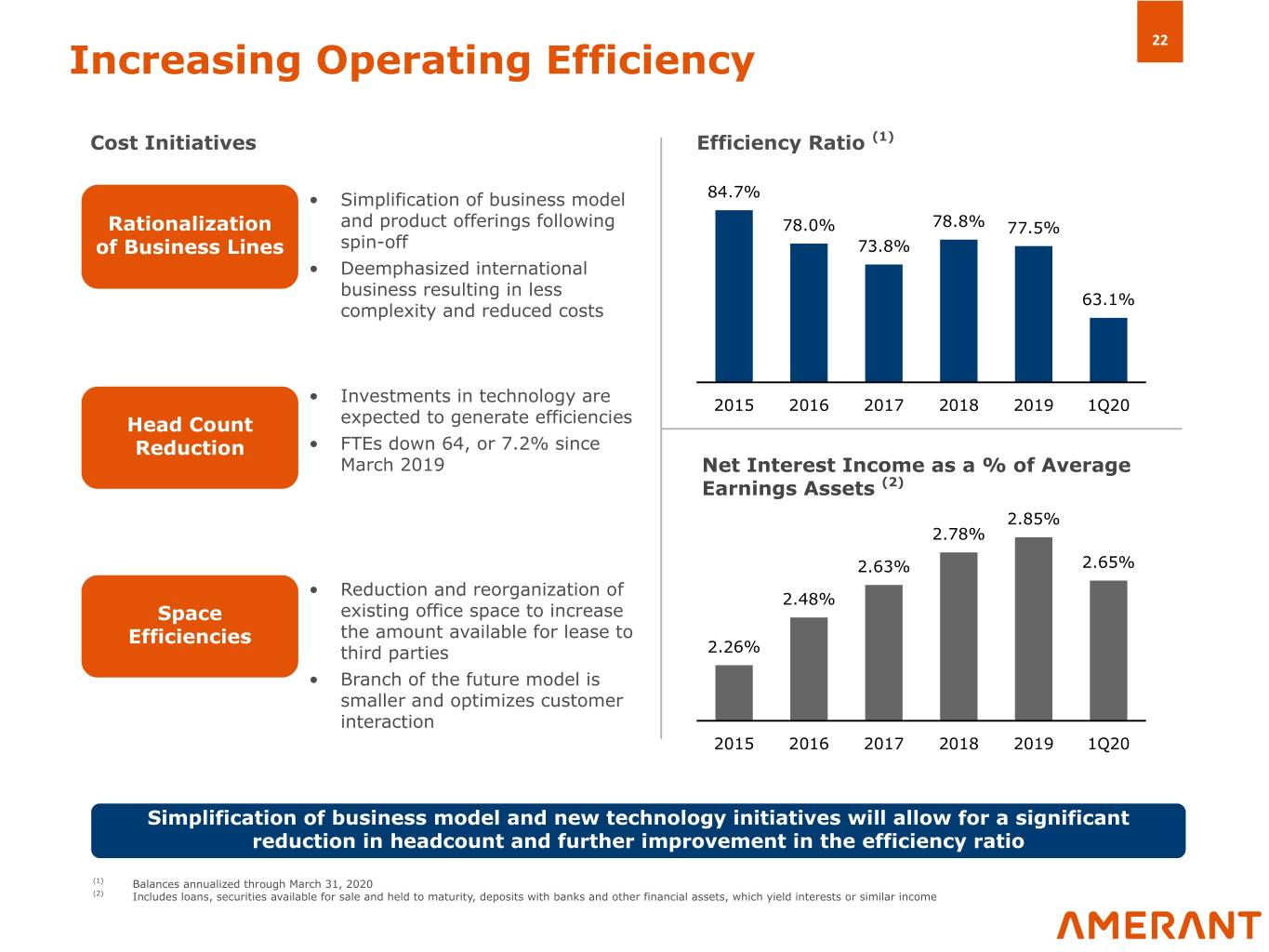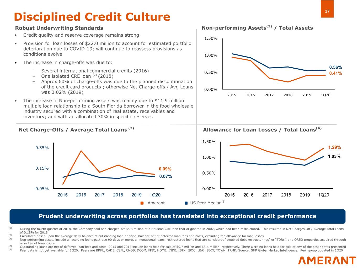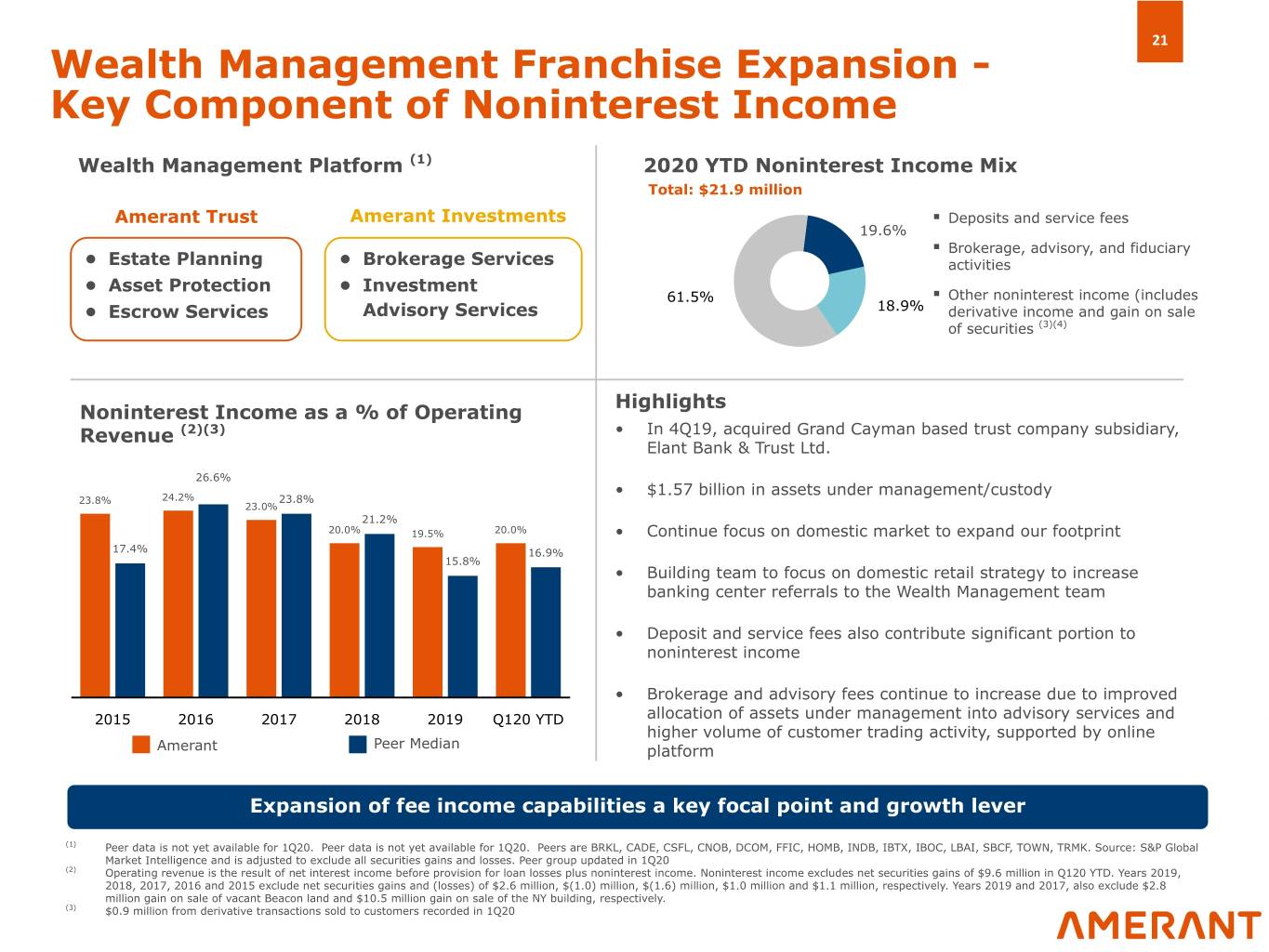 38 Appendix 2 Non-GAAP Financial Measures Reconciliations (cont’d) (in thousands, except per share data and percentages) 1Q20 2019 2018 2017 Efficiency ratio 63.07 % 77.47 % 78.77 % 73.84 % Less: impact of restructuring costs (0.50)% (1.89)% (2.34)% — % Less: impact of total spin-off costs — % — % (2.44)% (1.86)% Plus: gain on sale of vacant Beacon land — % 0.81 % — % — % Plus: gain on sale of New York building —% — % — % 2.78 % Adjusted efficiency ratio 62.57 % 76.39 % 73.99 % 74.76 % Total noninterest income $ 21,910 $ 57,110 $ 53,875 $ 71,485 Less: securities gains, net 9,620 2,605 (999) (1,601) Less: net gain on sale of properties — 2,795 — 10,469 Adjusted noninterest income for operating revenue $ 12,290 $ 51,710 $ 54,874 $ 62,617 Net interest income before provision 49,229 213,088 219,039 209,710 Operating revenue 61,519 264,798 273,913 272,327 Adjusted noninterest income as a % of operating revenue 20.0 % 19.5 % 20.0 % 23.0 % Tangible common equity ratio: Stockholders' equity $ 841,117 $ 834,701 $ 747,418 $ 753,450 Less: Goodwill and other intangibles (21,698) (21,744) (21,042) (21,186) Tangible common stockholders' equity $ 819,419 $ 812,957 $ 726,376 $ 732,264 Total assets 8,098,810 7,985,399 8,124,347 8,436,767 Less: Goodwill and other intangibles (21,698) (21,744) (21,042) (21,186) Tangible assets $ 8,077,112 $ 7,963,655 $ 8,103,305 $ 8,415,581 Common shares outstanding 42,166 43,146 43,183 42,489 Tangible common equity ratio 10.14 % 10.21 % 8.96 % 8.70 % Stockholders' book value per common share $ 19.95 $ 19.35 $ 17.31 $ 17.73 Tangible stockholders' book value per common share $ 19.43 $ 18.84 $ 16.82 $ 17.23 (1) Expenses incurred for actions designed to implement the Company’s strategy as a new independent company. These actions include, but are not limited to, reductions in workforce, streamlining operational processes, rolling out the Amerant brand, implementation of new technology system applications, enhanced sales tools and training, expanded product offerings and improved customer analytics to identify opportunities. (2) The spin-off caused an unexpected early distribution for U.S. federal income tax purposes from our deferred compensation plan. This distribution was taxable to plan participants as ordinary income during 2018. We partially compensated plan participants, in the aggregate amount of $1.2 million, for the higher tax expense they incurred as a result of the distribution increasing the plan participants' estimated effective federal income tax rates by recording a contribution to the plan on behalf of its participants. The after tax net effect of this $1.2 million contribution for the period ended September 30, 2018, was approximately $952,000. As a result of the early taxable distribution to plan participants, we expensed and deducted for federal income tax purposes, previously deferred compensation of approximately $8.1 million, resulting in an estimated tax credit of $1.7 million, which exceeded the amount of the tax gross-up paid to plan participants. (3) Calculated based upon the estimated annual effective tax rate for the periods, which excludes the tax effect of discrete items, and the amounts that resulted from the permanent difference between spin-off costs that are non-deductible for Federal and state income tax purposes, and total spin-off costs recognized in the consolidated financial statements. The estimated annual effective rate applied for the calculation differs from the reported effective tax rate since it is based on a different mix of statutory rates applicable to these expenses and to the rates applicable to the Company and its subsidiaries. (4) Calculated based upon an estimated annual effective rate of 31.71%. (5) As of March 31, 2020, December 31, 2019, potential dilutive instruments consisted unvested shares of restricted stock and restricted stock units mainly related to the Company’s IPO in 2018, totaling 482,316 and 530,620, respectively. These potential dilutive instruments were included in the diluted earnings per share computation because, when the unamortized deferred compensation cost related to these shares was divided by the average market price per share at those dates, fewer shares would have been purchased than restricted shares assumed issued. Therefore, at those dates, such awards resulted in higher diluted weighted averages shares outstanding than basic weighted average shares outstanding, and had a dilutive effect in per share earnings. We had no outstanding dilutive instruments as of any period prior to December 2018.