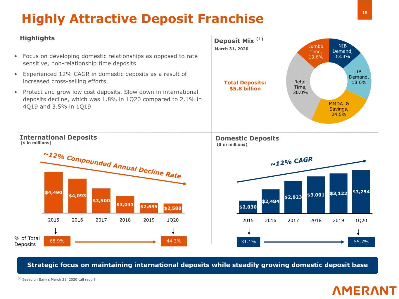 17 Disciplined Credit Culture Robust Underwriting Standards Non-performing Assets(3) / Total Assets • Credit quality and reserve coverage remains strong 1.50% • Provision for loan losses of $22.0 million to account for estimated portfolio deterioration due to COVID-19; will continue to reassess provisions as conditions evolve 1.00% • The increase in charge-offs was due to: 0.56% – Several international commercial credits (2016) 0.50% 0.41% – One isolated CRE loan (1) (2018) – Approx 60% of charge-offs was due to the planned discontinuation of the credit card products ; otherwise Net Charge-offs / Avg Loans 0.00% was 0.02% (2019) 2015 2016 2017 2018 2019 1Q20 • The increase in Non-performing assets was mainly due to $11.9 million multiple loan relationship to a South Florida borrower in the food wholesale industry secured with a combination of real estate, receivables and inventory; and with an allocated 30% in specific reserves Net Charge-Offs / Average Total Loans (2) Allowance for Loan Losses / Total Loans(4) 1.50% 0.35% 1.29% 1.00% 1.03% 0.15% 0.09% 0.50% 0.07% -0.05% 0.00% 2015 2016 2017 2018 2019 1Q20 2015 2016 2017 2018 2019 1Q20 Amerant US Peer Median(5) Prudent underwriting across portfolios has translated into exceptional credit performance (1) During the fourth quarter of 2018, the Company sold and charged-off $5.8 million of a Houston CRE loan that originated in 2007, which had been restructured. This resulted in Net Charges Off / Average Total Loans of 0.18% for 2018 (2) Calculated based upon the average daily balance of outstanding loan principal balance net of deferred loan fees and costs, excluding the allowance for loan losses (3) Non-performing assets include all accruing loans past due 90 days or more, all nonaccrual loans, restructured loans that are considered “troubled debt restructurings” or “TDRs”, and OREO properties acquired through or in lieu of foreclosure (4) Outstanding loans are net of deferred loan fees and costs. 2015 and 2017 include loans held for sale of $9.7 million and $5.6 million, respectively. There were no loans held for sale at any of the other dates presented (5) Peer data is not yet available for 1Q20. Peers are BRKL, CADE, CSFL, CNOB, DCOM, FFIC, HOMB, INDB, IBTX, IBOC, LBAI, SBCF, TOWN, TRMK. Source: S&P Global Market Intelligence. Peer group updated in 1Q20