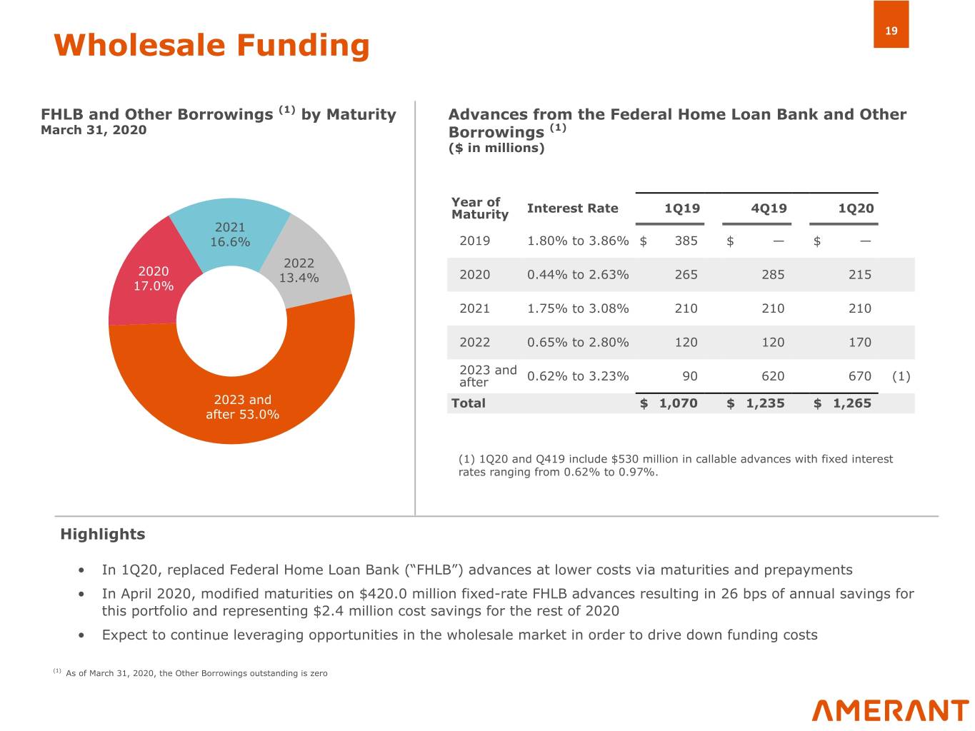 19 Wholesale Funding FHLB and Other Borrowings (1) by Maturity Advances from the Federal Home Loan Bank and Other March 31, 2020 Borrowings (1) ($ in millions) Year of Maturity Interest Rate 1Q19 4Q19 1Q20 2021 16.6% 2019 1.80% to 3.86% $ 385 $ — $ — 2022 2020 13.4% 2020 0.44% to 2.63% 265 285 215 17.0% 2021 1.75% to 3.08% 210 210 210 2022 0.65% to 2.80% 120 120 170 2023 and 0.62% to 3.23% 90 620 670 (1) after 2023 and Total $ 1,070 $ 1,235 $ 1,265 after 53.0% (1) 1Q20 and Q419 include $530 million in callable advances with fixed interest rates ranging from 0.62% to 0.97%. Highlights • In 1Q20, replaced Federal Home Loan Bank (“FHLB”) advances at lower costs via maturities and prepayments • In April 2020, modified maturities on $420.0 million fixed-rate FHLB advances resulting in 26 bps of annual savings for this portfolio and representing $2.4 million cost savings for the rest of 2020 • Expect to continue leveraging opportunities in the wholesale market in order to drive down funding costs (1) As of March 31, 2020, the Other Borrowings outstanding is zero