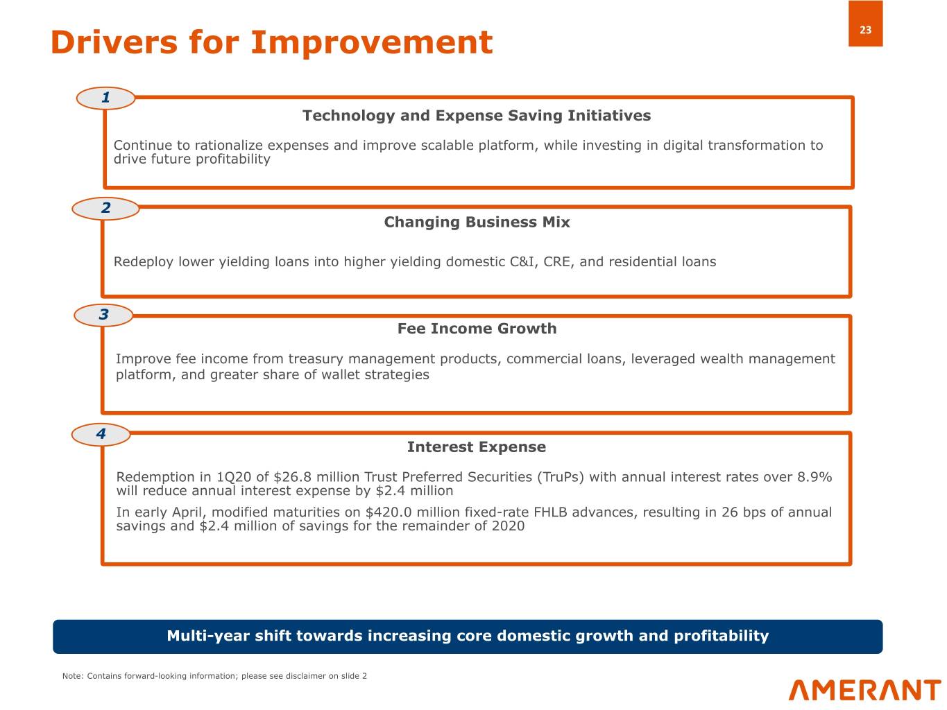 Drivers for Improvement 23 1 Technology and Expense Saving Initiatives Continue to rationalize expenses and improve scalable platform, while investing in digital transformation to drive future profitability 2 Changing Business Mix Redeploy lower yielding loans into higher yielding domestic C&I, CRE, and residential loans 3 Fee Income Growth Improve fee income from treasury management products, commercial loans, leveraged wealth management platform, and greater share of wallet strategies 4 Interest Expense Redemption in 1Q20 of $26.8 million Trust Preferred Securities (TruPs) with annual interest rates over 8.9% will reduce annual interest expense by $2.4 million In early April, modified maturities on $420.0 million fixed-rate FHLB advances, resulting in 26 bps of annual savings and $2.4 million of savings for the remainder of 2020 Multi-year shift towards increasing core domestic growth and profitability Note: Contains forward-looking information; please see disclaimer on slide 2