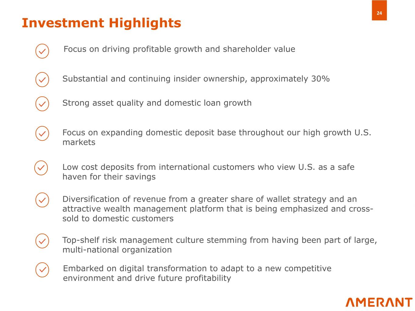 24 Investment Highlights Focus on driving profitable growth and shareholder value Substantial and continuing insider ownership, approximately 30% Strong asset quality and domestic loan growth Focus on expanding domestic deposit base throughout our high growth U.S. markets Low cost deposits from international customers who view U.S. as a safe haven for their savings Diversification of revenue from a greater share of wallet strategy and an attractive wealth management platform that is being emphasized and cross- sold to domestic customers Top-shelf risk management culture stemming from having been part of large, multi-national organization Embarked on digital transformation to adapt to a new competitive environment and drive future profitability